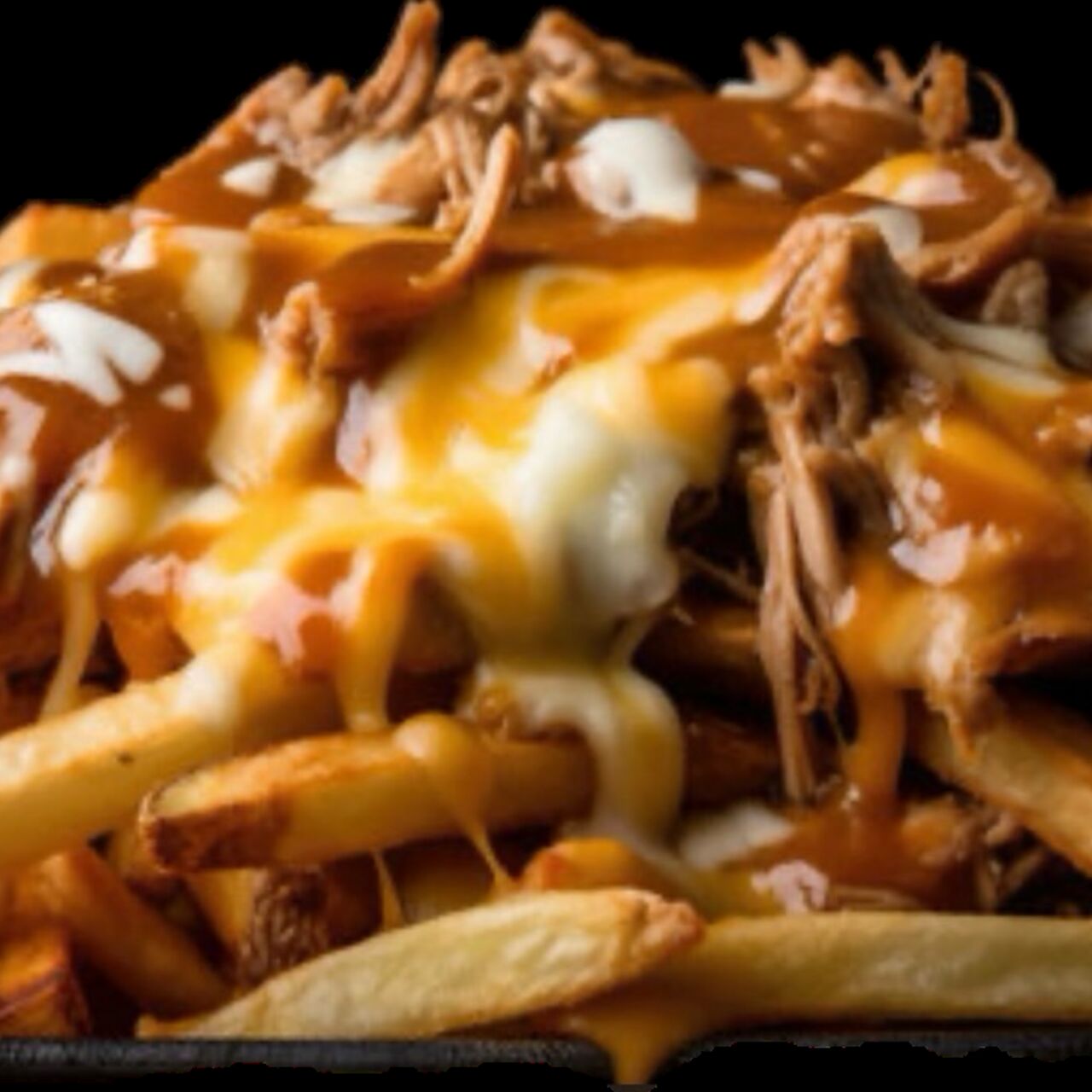 店舗でじっくり低温で1日かけてつくったUSプルドポークをフレンチフライにたっぷり。チーズも最高。