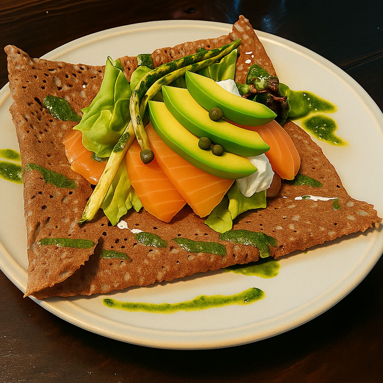 スモークサーモンやクリームチーズ・アボカド・バジルソースなどを使用した人気のガレットです。
