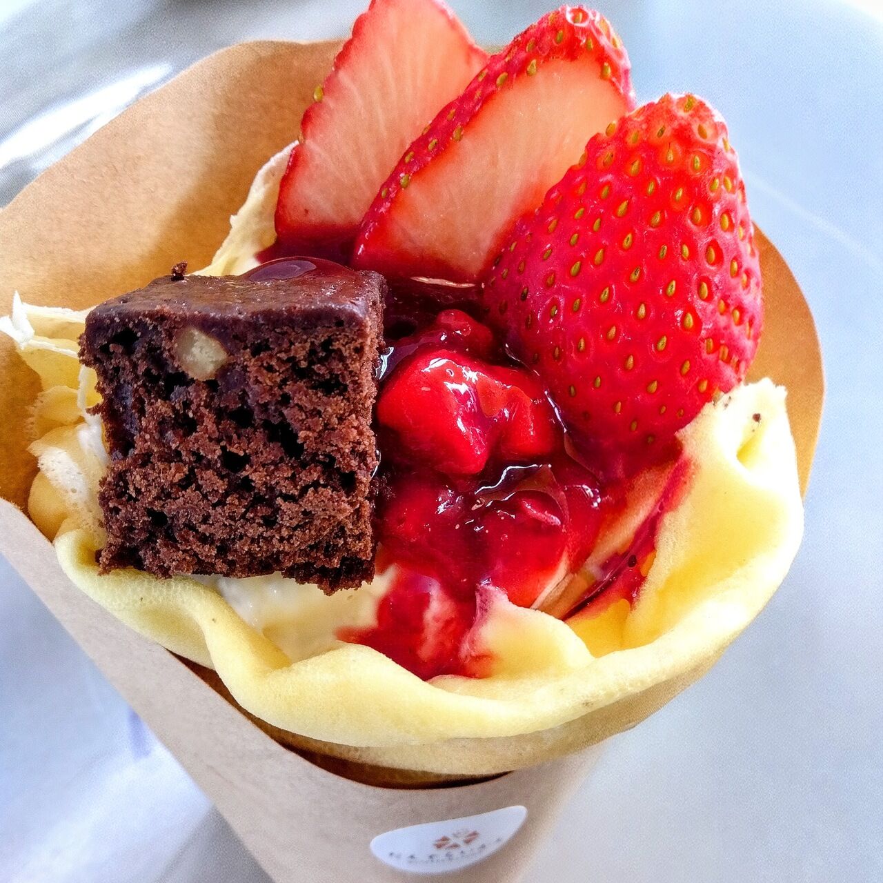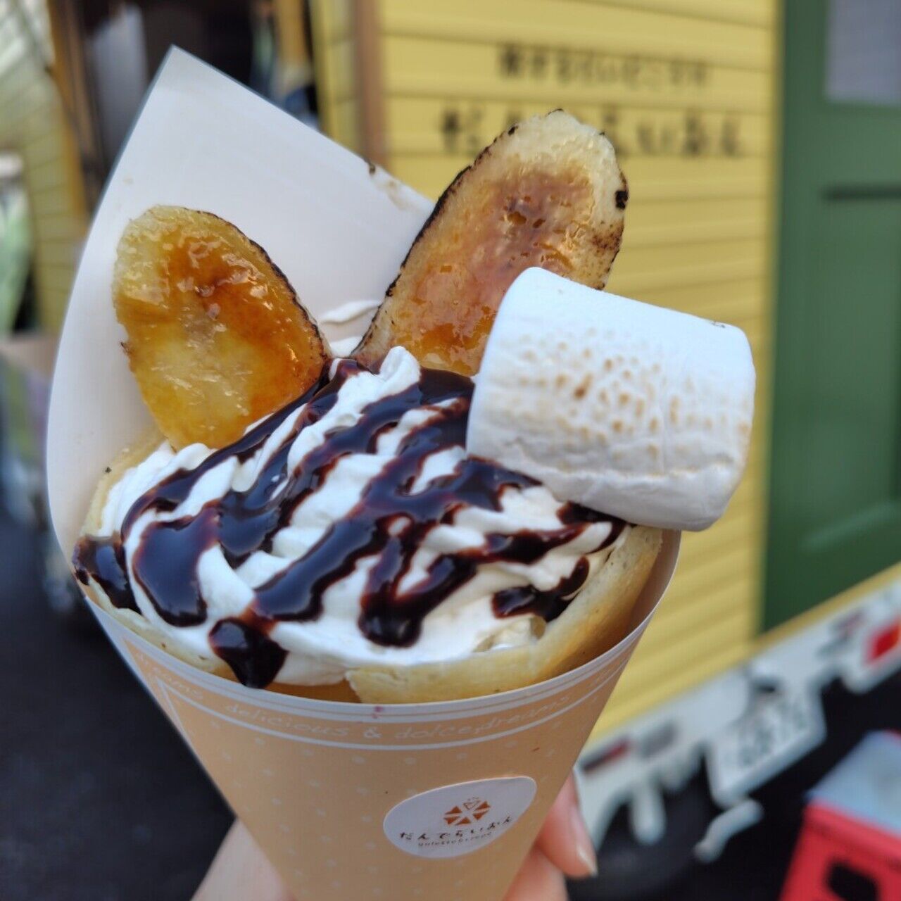 北海道産生乳100%を使用したこだわりの生クリームとバナナ・チョコソース・マシュマロが入った一番人気のクレープ