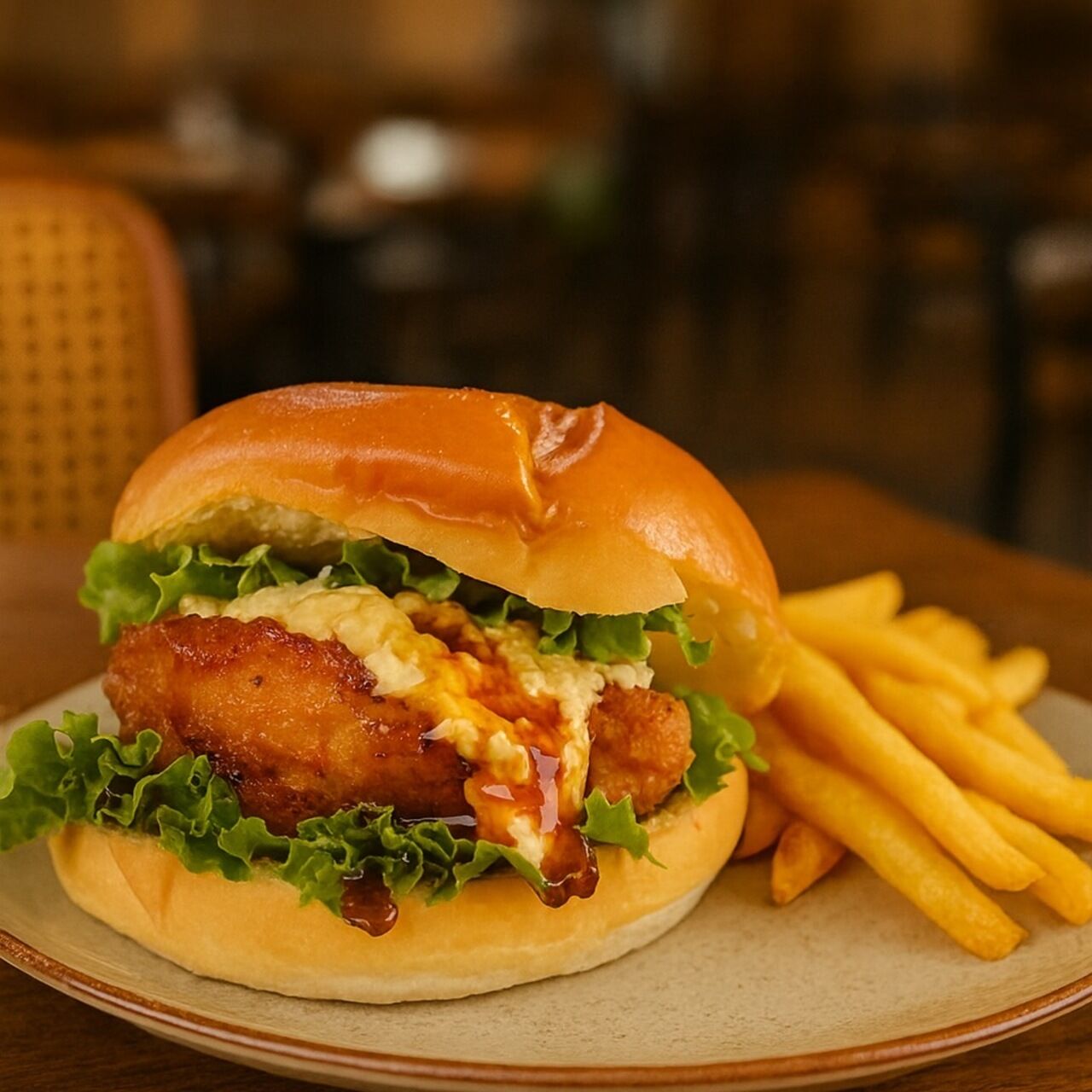 いつものロケットチキンよりも大きくカットしたチキンと野菜をバンズに挟んだものとポテトのセットになります!付属のタルタルソースをバンズの中にかけて召し上がります!