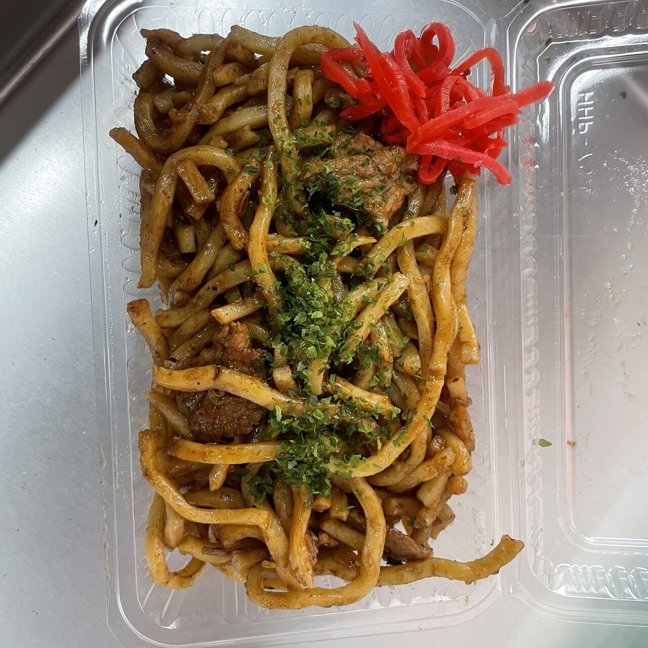 太麺もちもちでソースは、オタフク焼きそばソースと焼きそばソース濃旨と最後にお好みソースと3種類のソースを使用