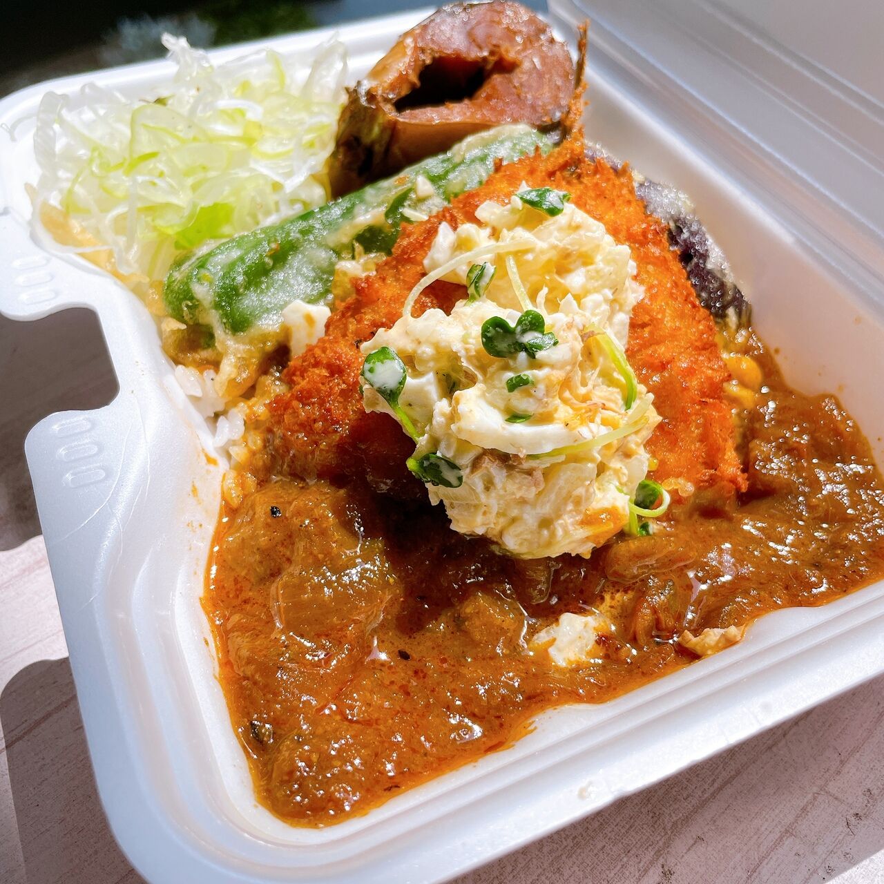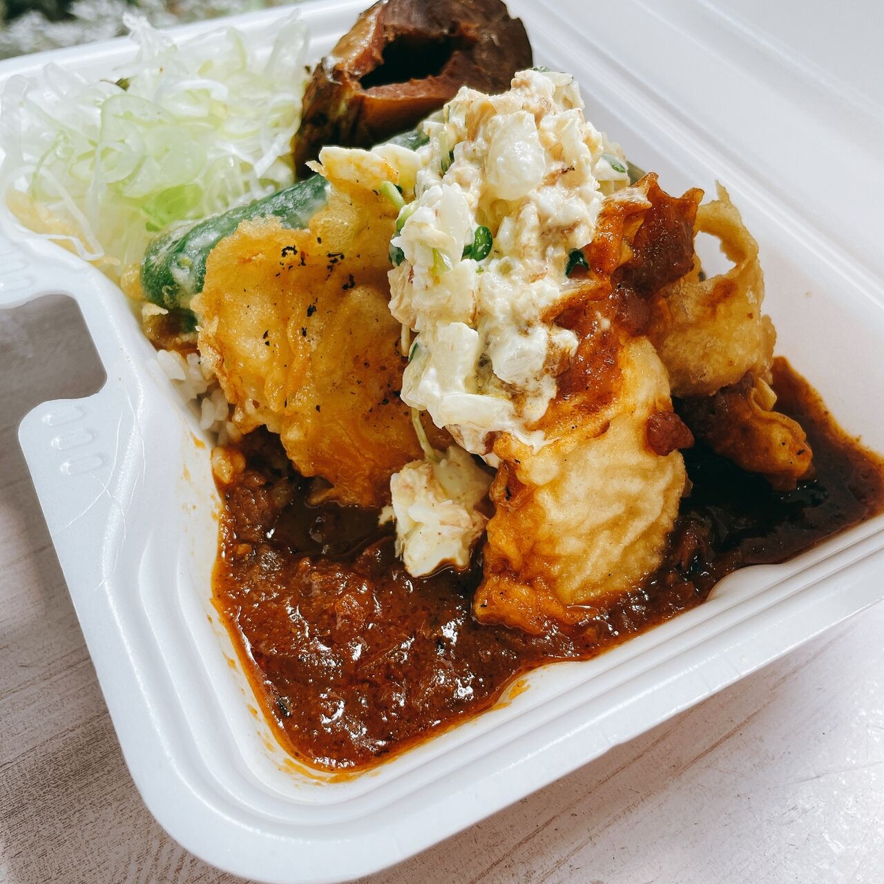 鯖黒煮1切とアジフライに野菜天2種。12種のスパイスを使ったスパイスカレーです。