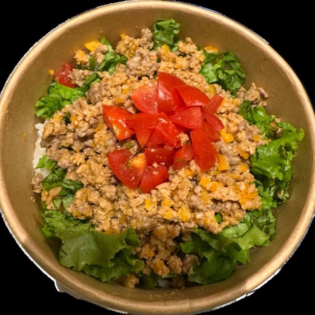 旬のお野菜とスパイスと大豆ミートと少しの合い挽きを使用しています。大人気のタコライスです。