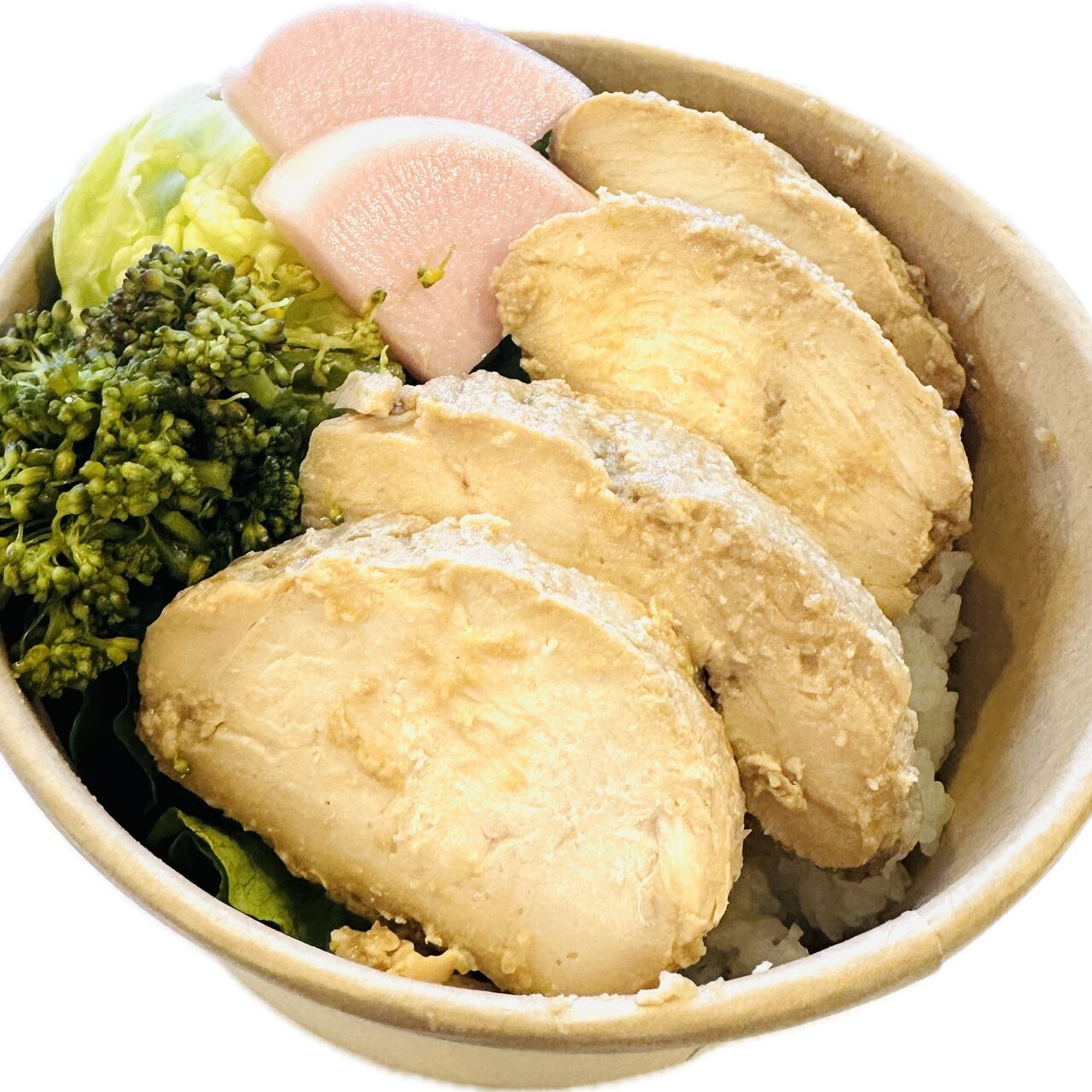 化学肥料農薬不使用のお米と、自家製塩麹に漬けた鶏肉を蒸しました。自家製ネギ塩レモンだれが人気です。