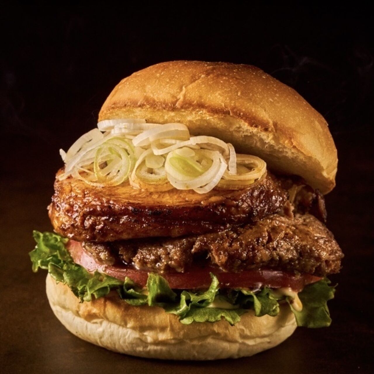 上州牛パティの上に自家製チャーシュー。前橋市公式キャラクター、ころとんとのコラボ商品。
