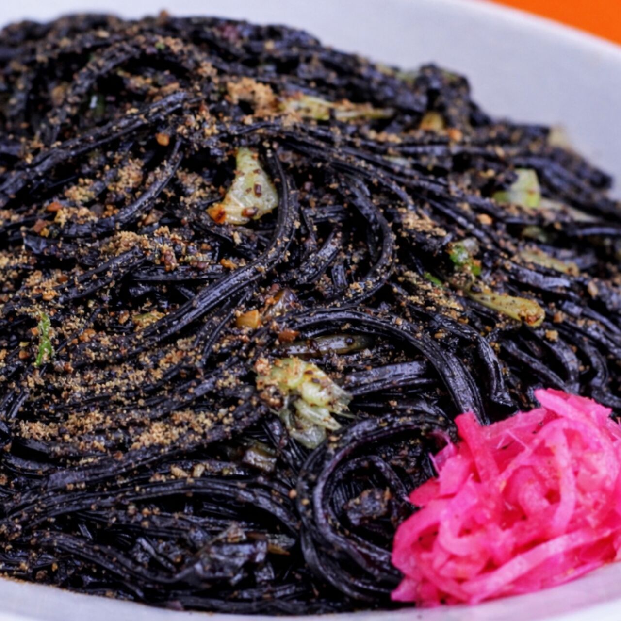 富士宮やきそばにイカ墨ソースを合わせることで黒く色付けしました。富士宮やきそばは魚粉を使用しているので魚介同士の相性は抜群です。