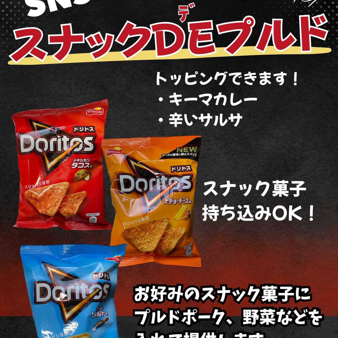 SNSで大流行!スナックにプルドポークと野菜、チーズが入った新感覚メニューです!