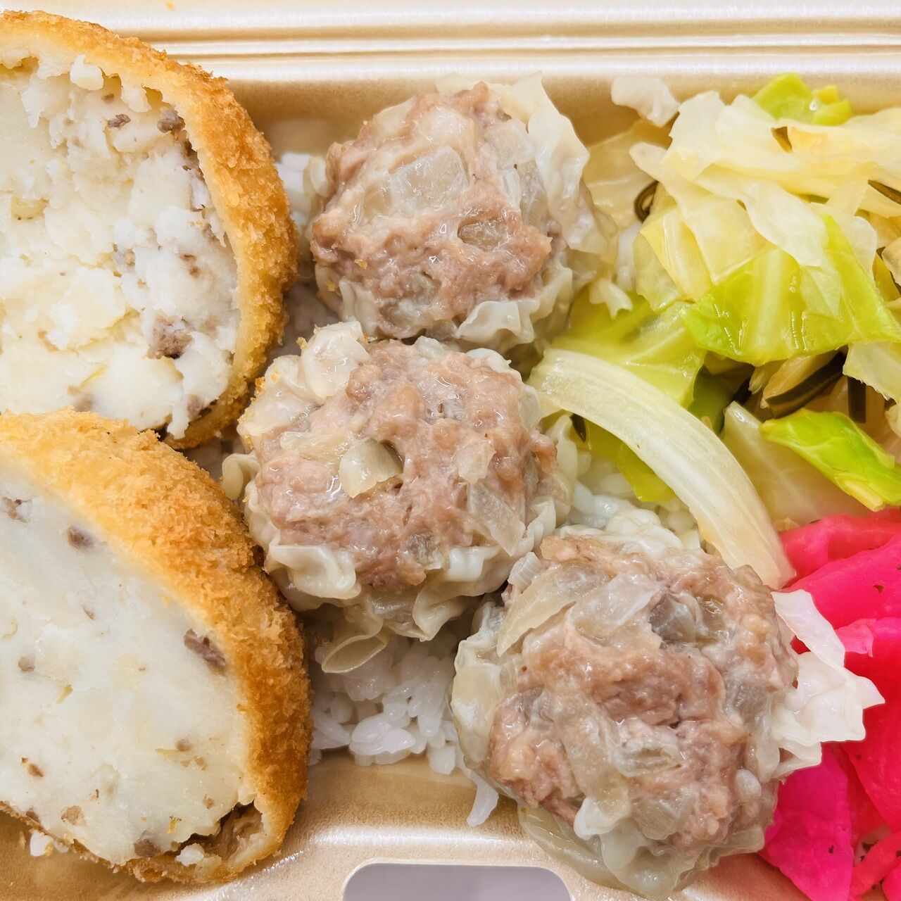 人気のミートコロッケと肉々しい手作りのせてシュウマイのお弁当。歯ごたえと肉のうまみをお楽しみ下さい。