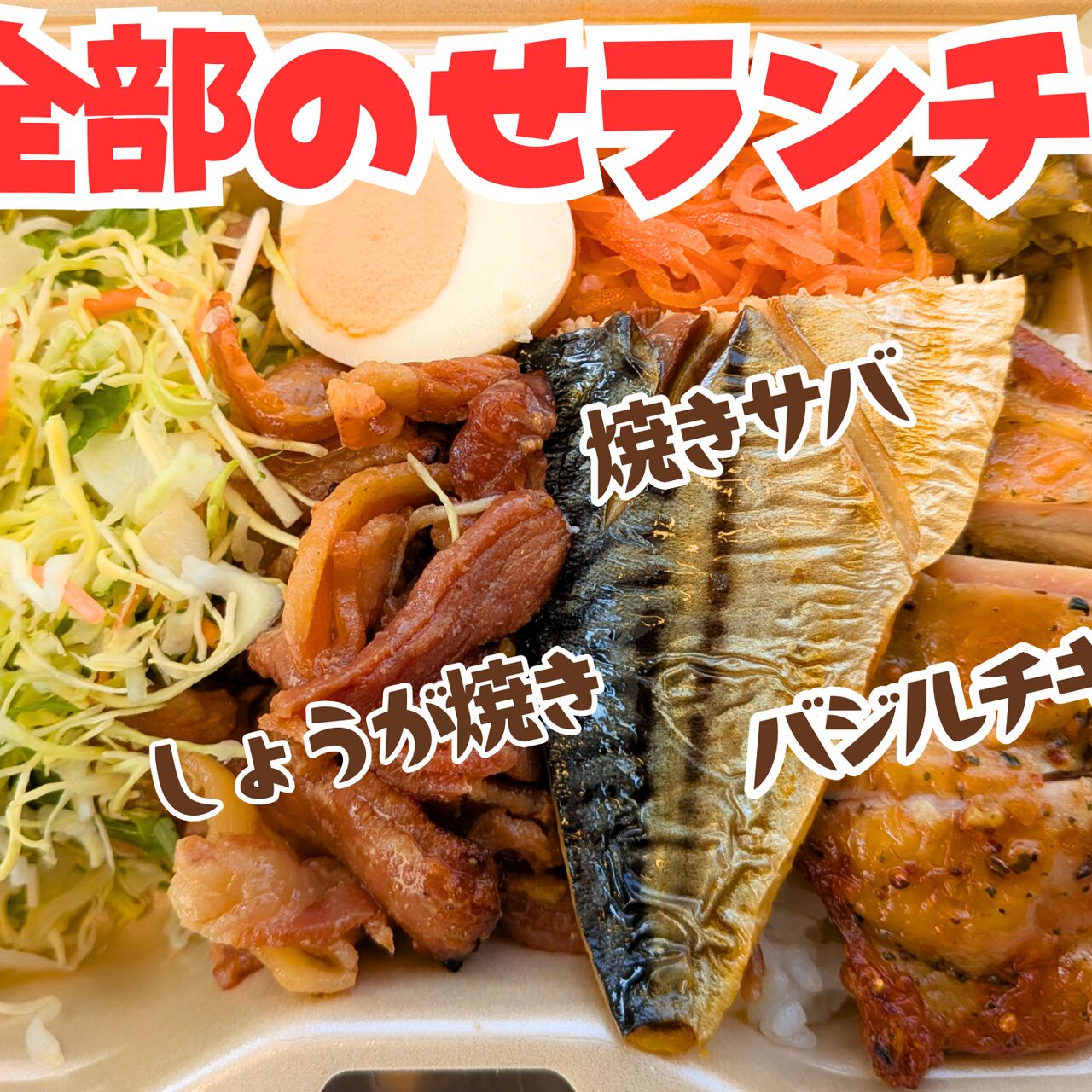 焼き鯖、しょうが焼き、バジルチキン全部乗っけた欲張りランチ