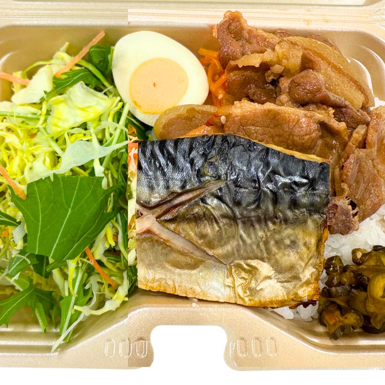 オメガ3脂肪酸を豊富に含む『焼きサバ』はランチにぴったりです!豚しょうが焼きと一緒に楽しめます