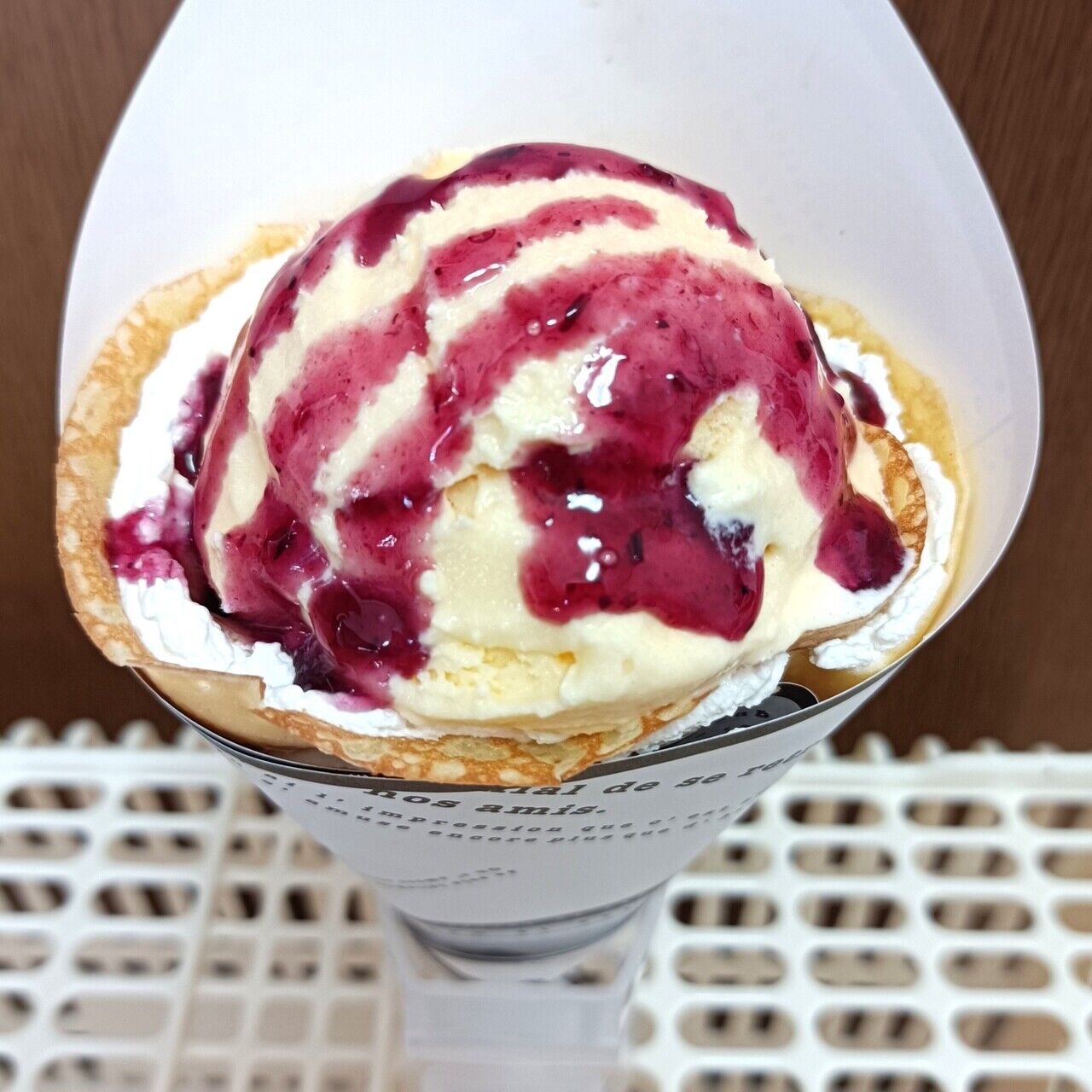 クレープにバニラアイスを乗せた贅沢クレープです。ソースは3種類から選べます。