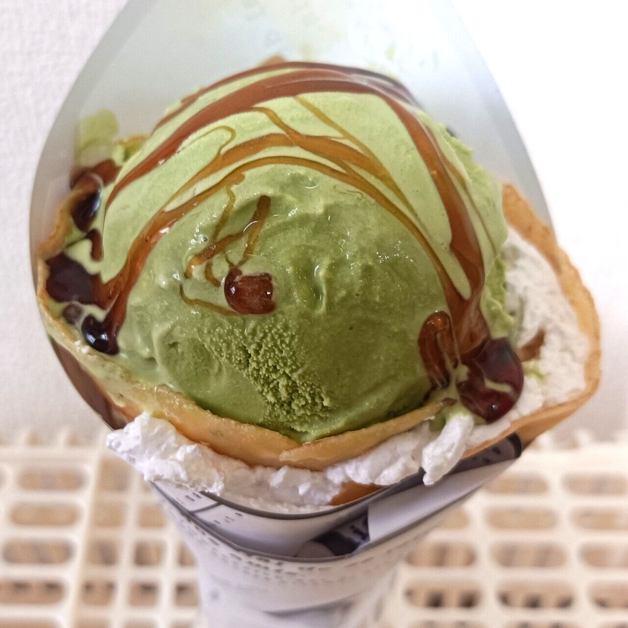 抹茶アイスに黒蜜をかけた和風のクレープです。
