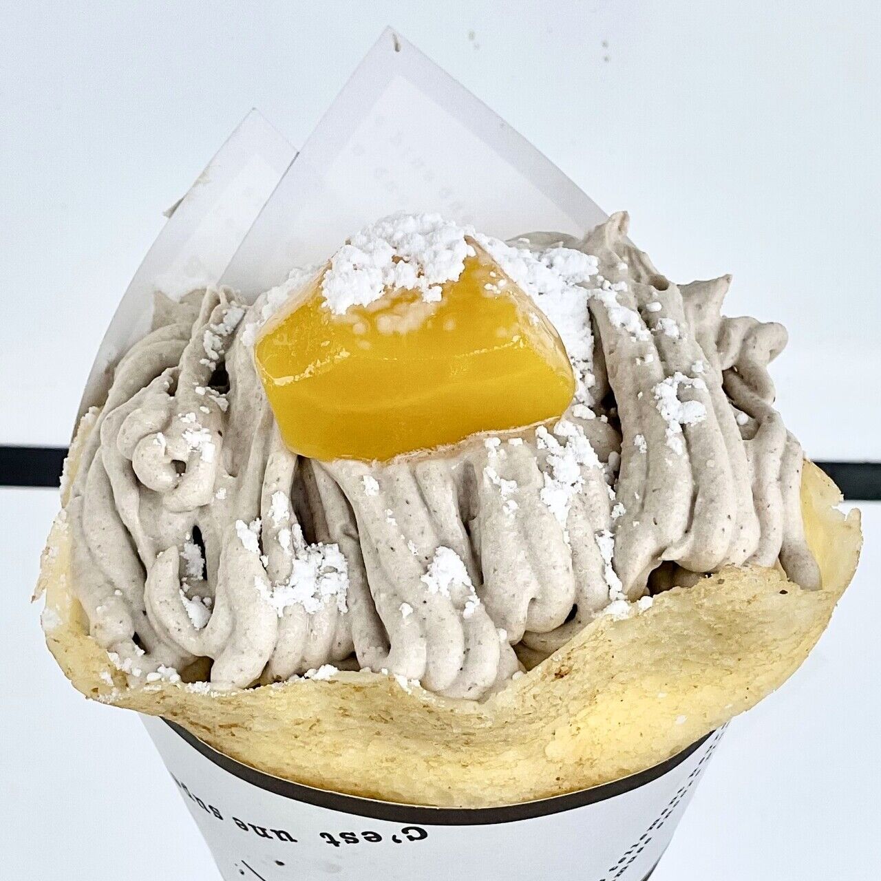 モンブランクリーム・モンブランケーキ・栗の甘露煮・天津甘栗などを使用した栗づくしのクレープです。