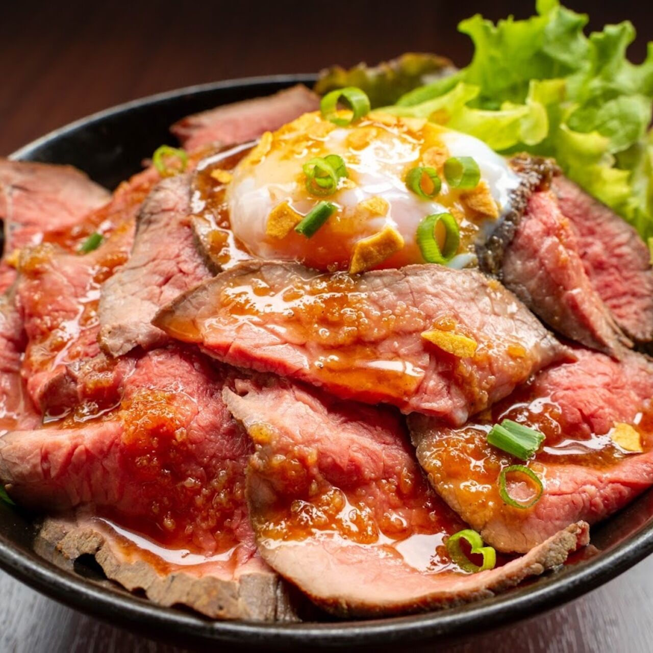 低温調理で牛肉の旨みを閉じ込め、しっとりとジューシーな食感に仕上がたローストビーフ丼です。
