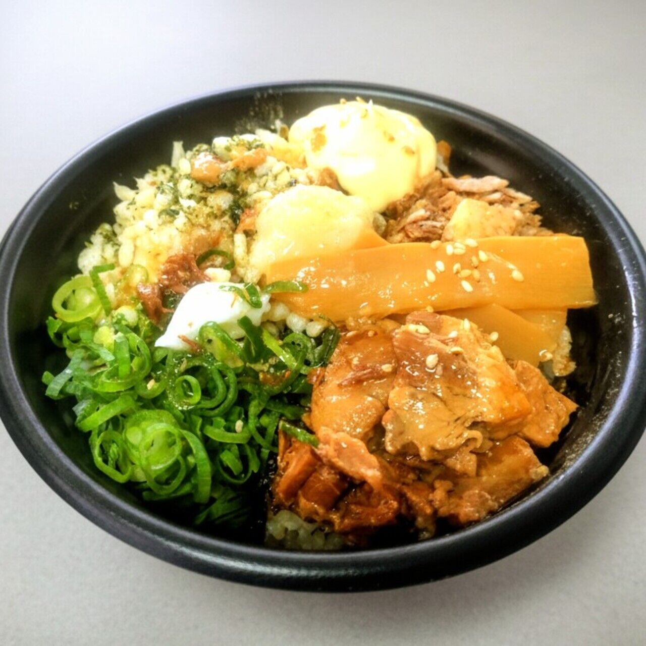 油そばをごはんにオリジナルアレンジ♪崩した角煮など沢山の具材と角煮の煮汁に特製タレ!まぜて召し上がれ♪※にんにく無し、増し対応してます。