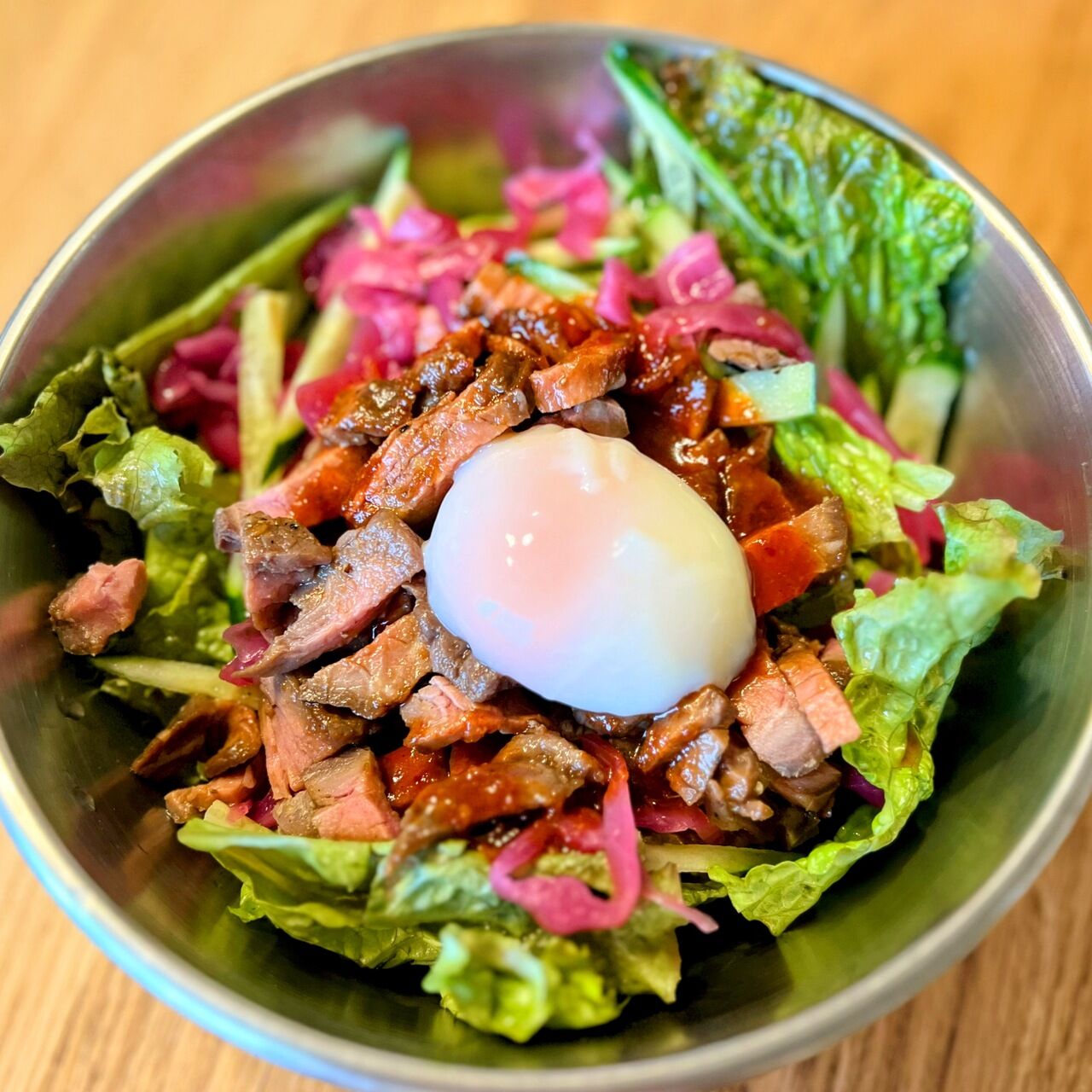 細切りの柔らかいローストビーフをコチュジャンベースの甘辛タレに合えてご飯と野菜サラダの上に乗せた丼