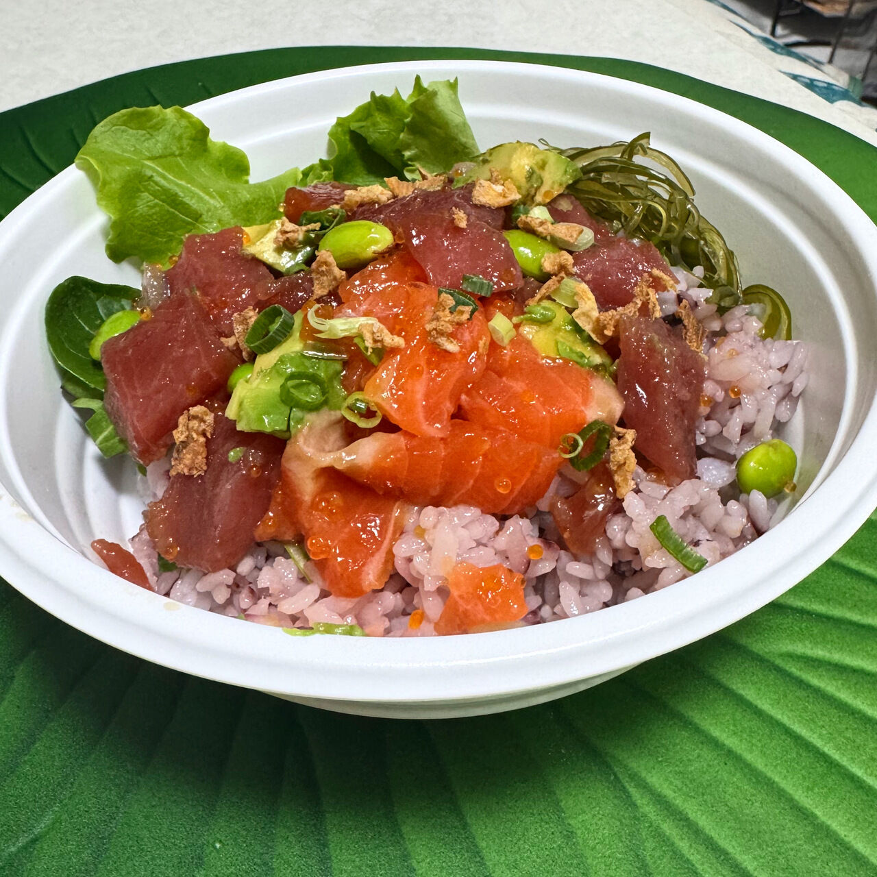 「ポキ」とは、魚介の切り身を調味料で和えたもの。ポキをご飯にのせたハワイ流の海鮮丼です。当店では黒米を使用してます。