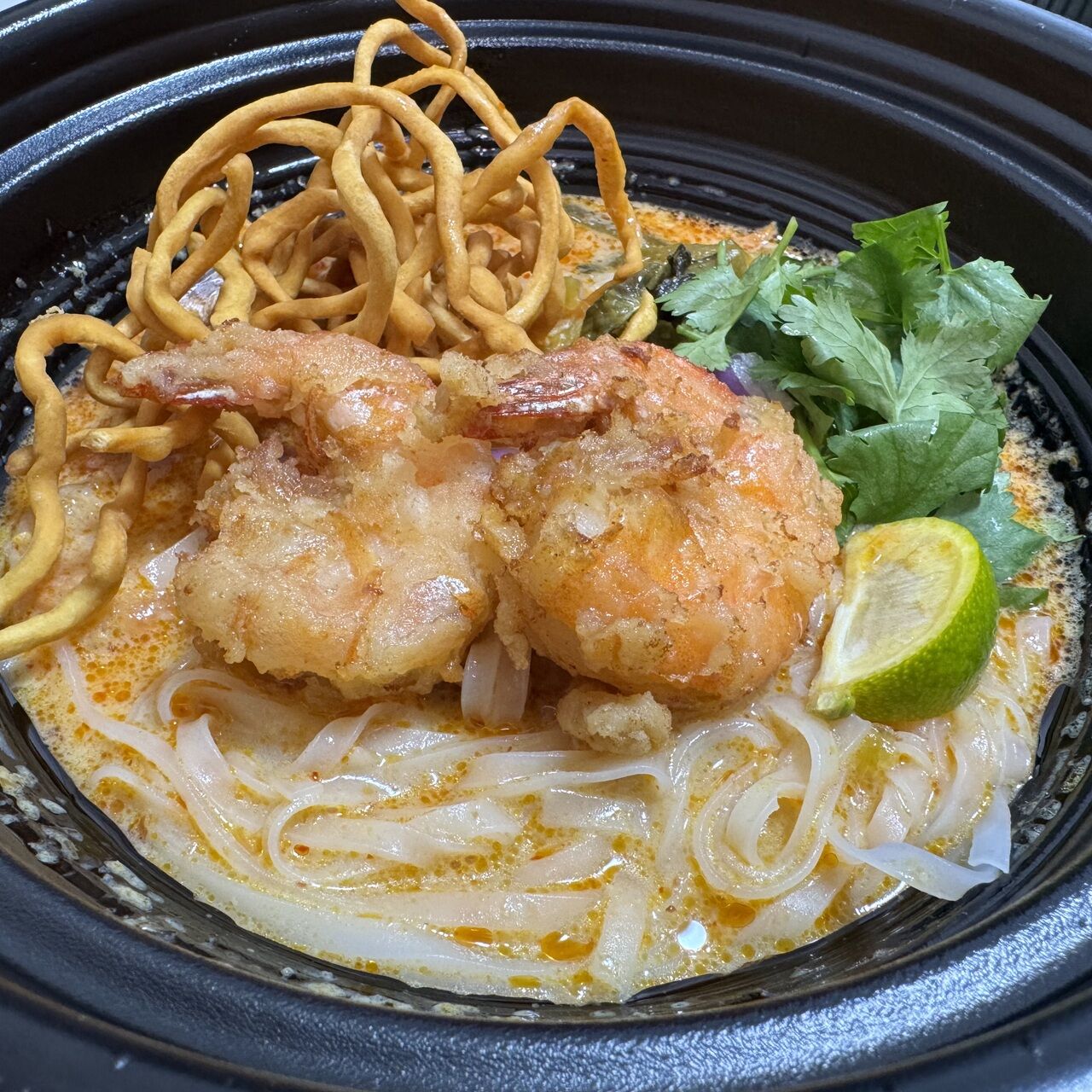 タイ料理で人気のカオソーイにガーリックシュリンプを乗せてハワイ風に仕上げました。ココナッツミルクの入ったカレーラーメンです。
