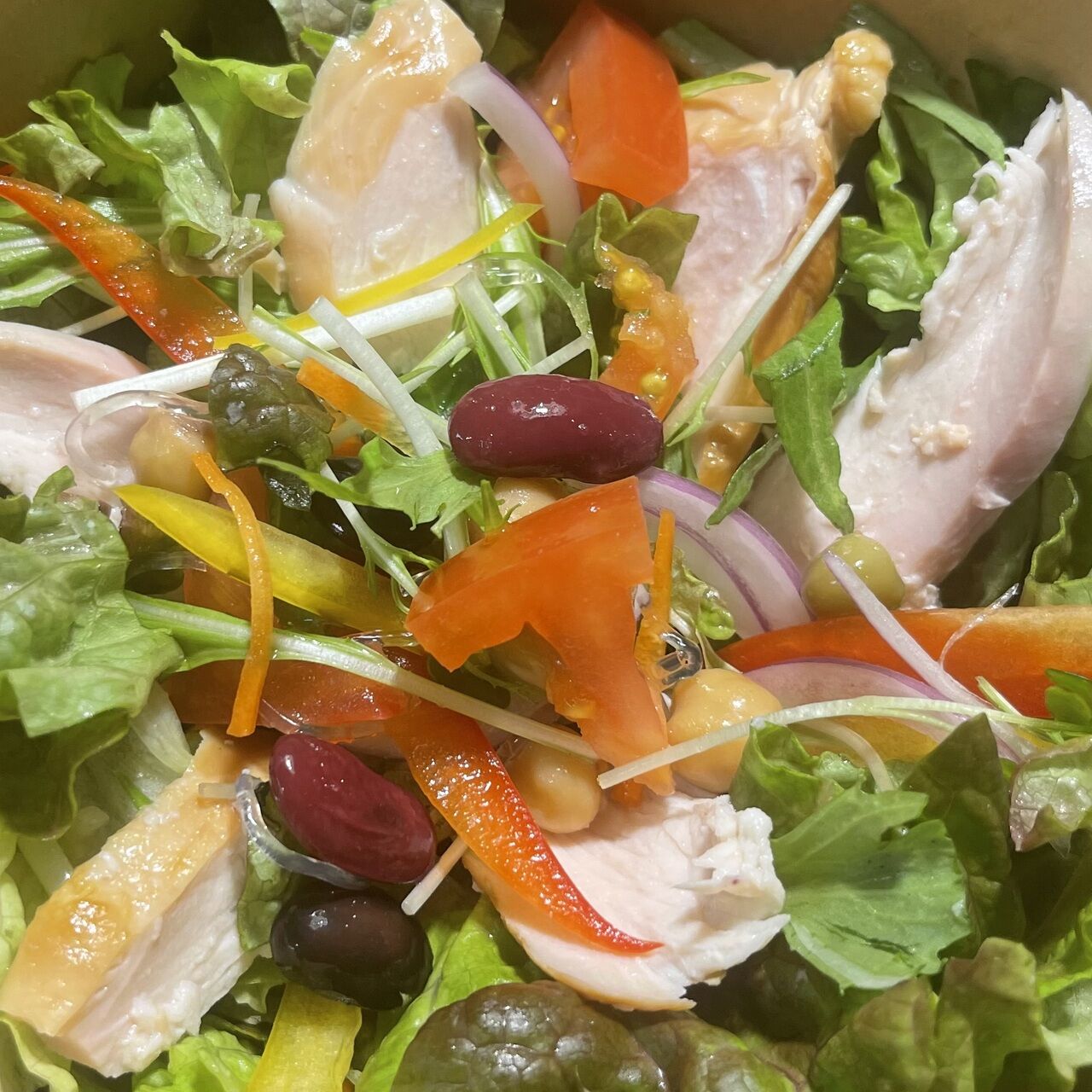 食物繊維、ビタミン、ミネラル等の栄養がとれるサラダ。スモークチキンでタンパク質もふんだんに摂取できます。