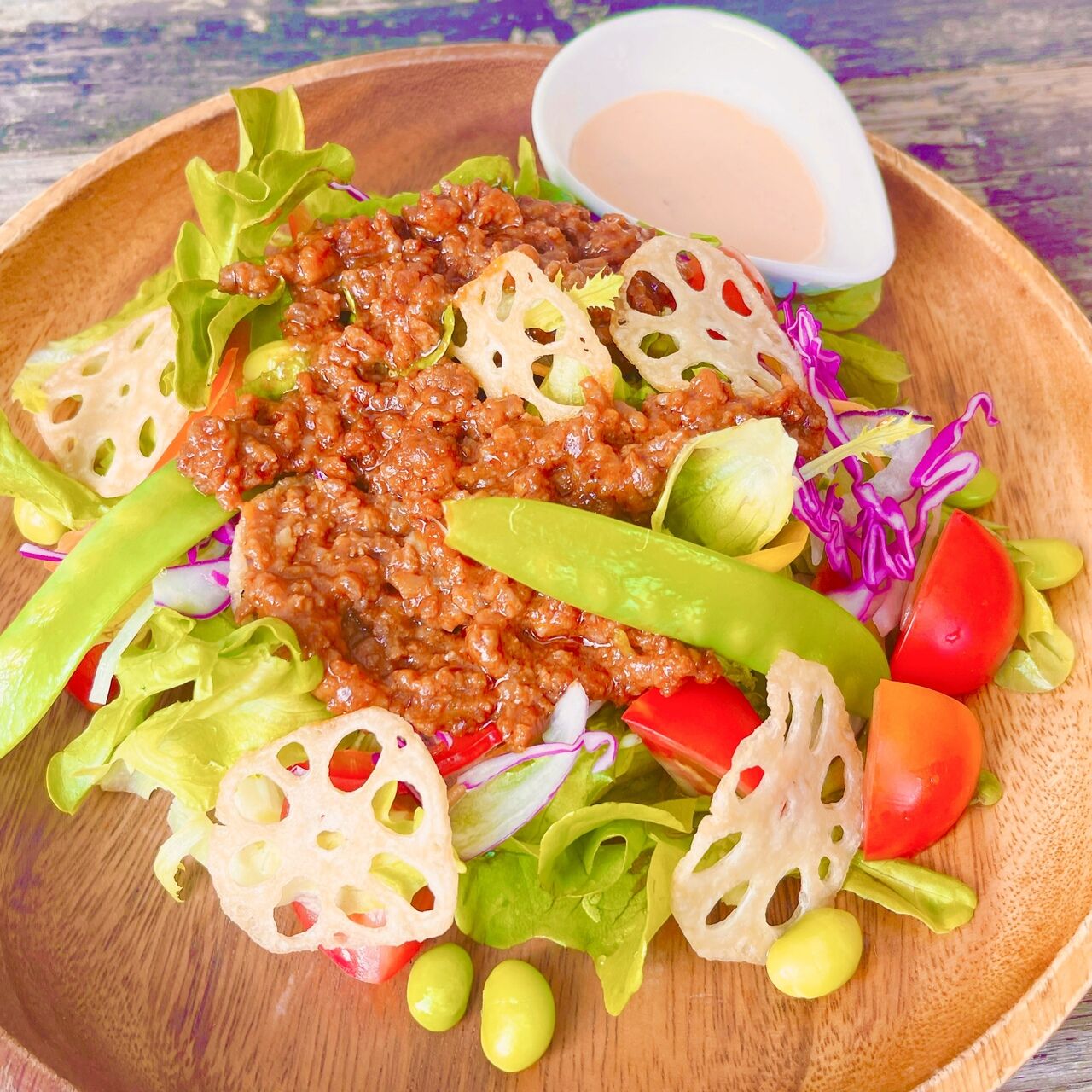 新鮮お野菜をたっぷり使用し、味わい深いミートをのせたボリューム満点サラダ