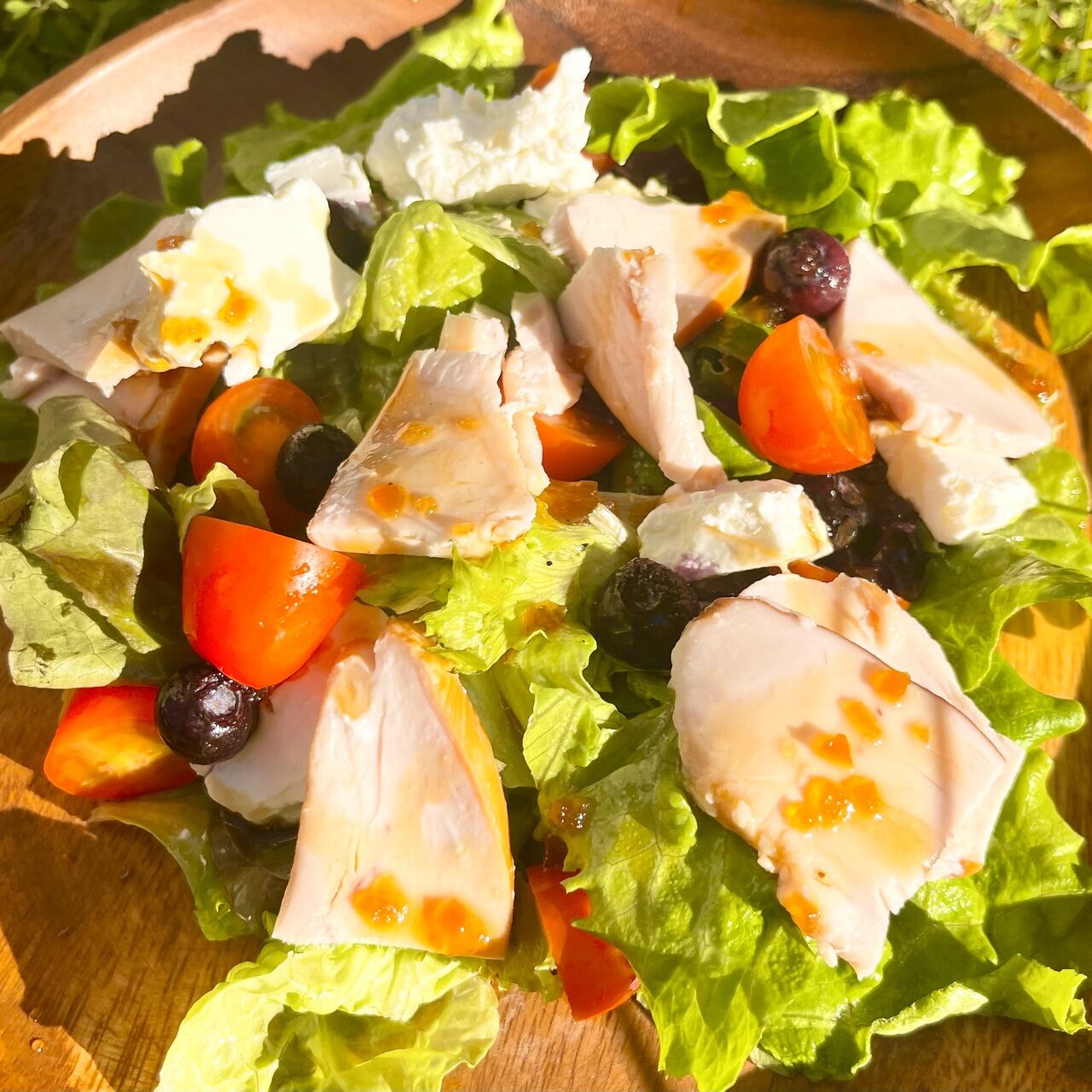 新鮮お野菜にスモークチキン、ブルーベリー、クリームチーズを和えました