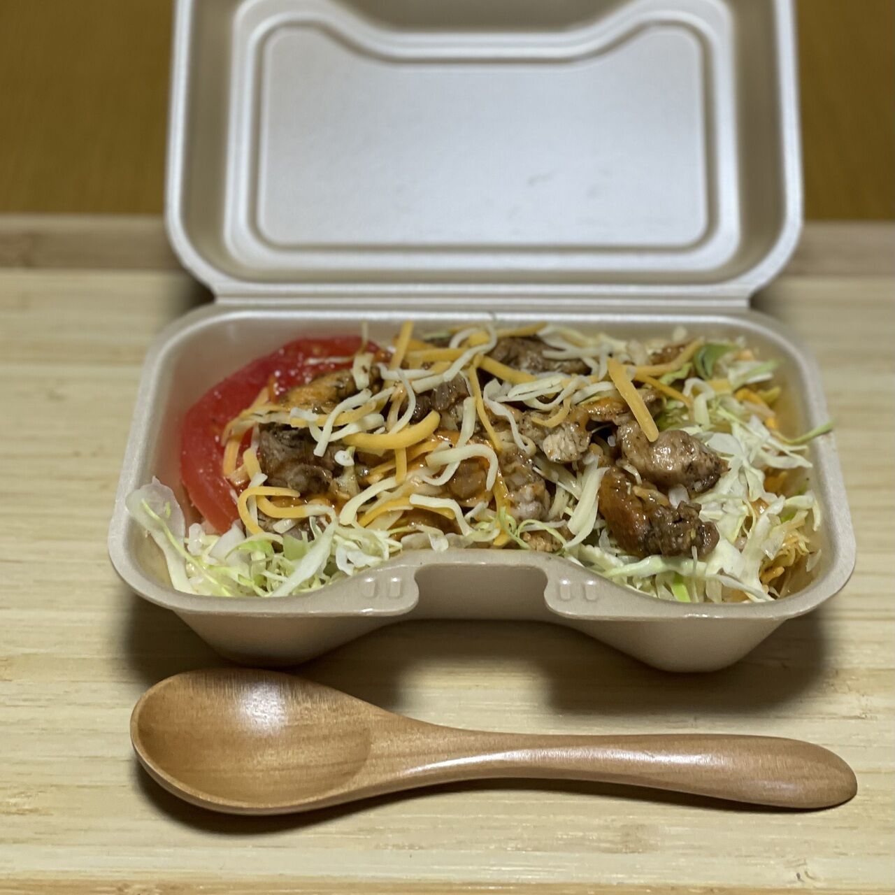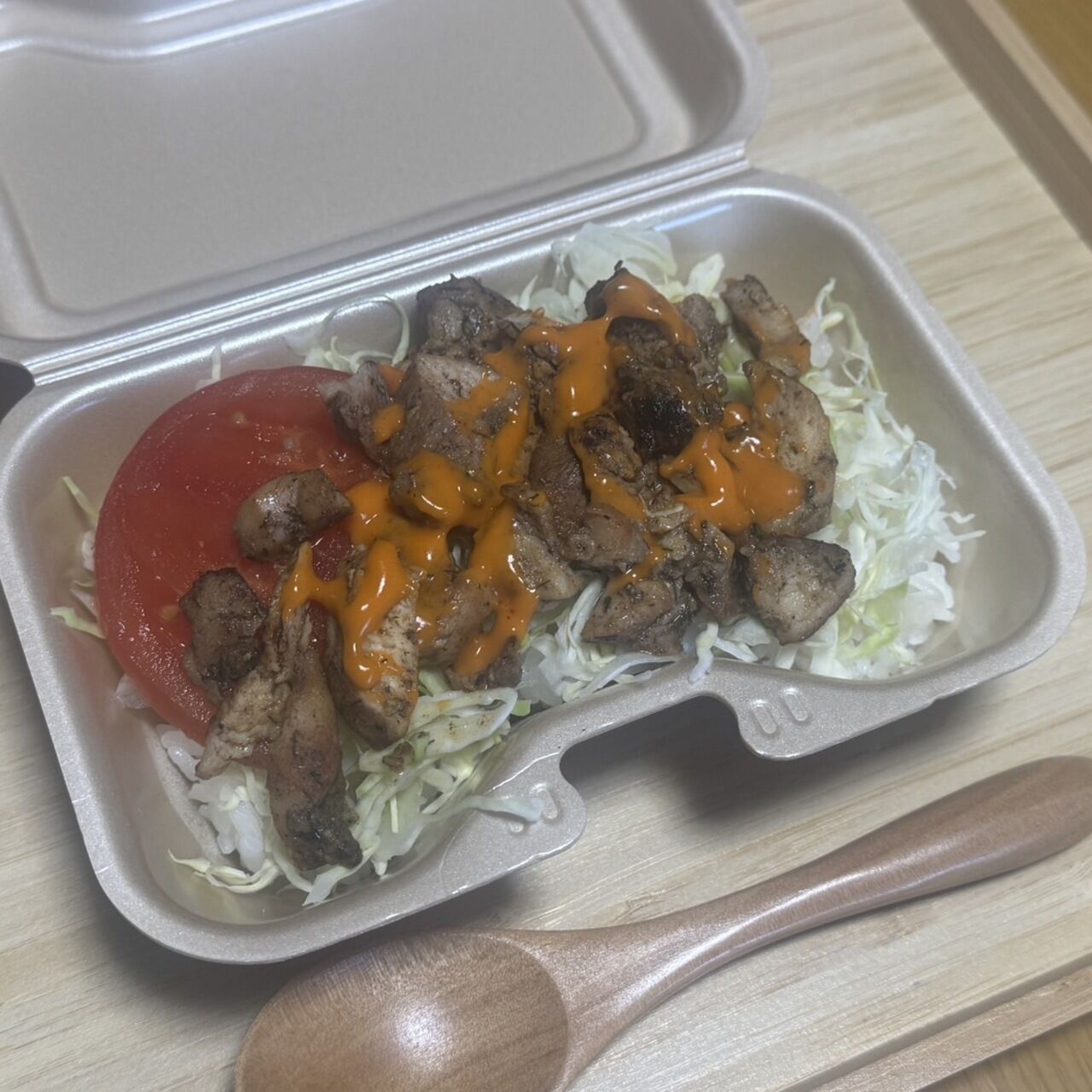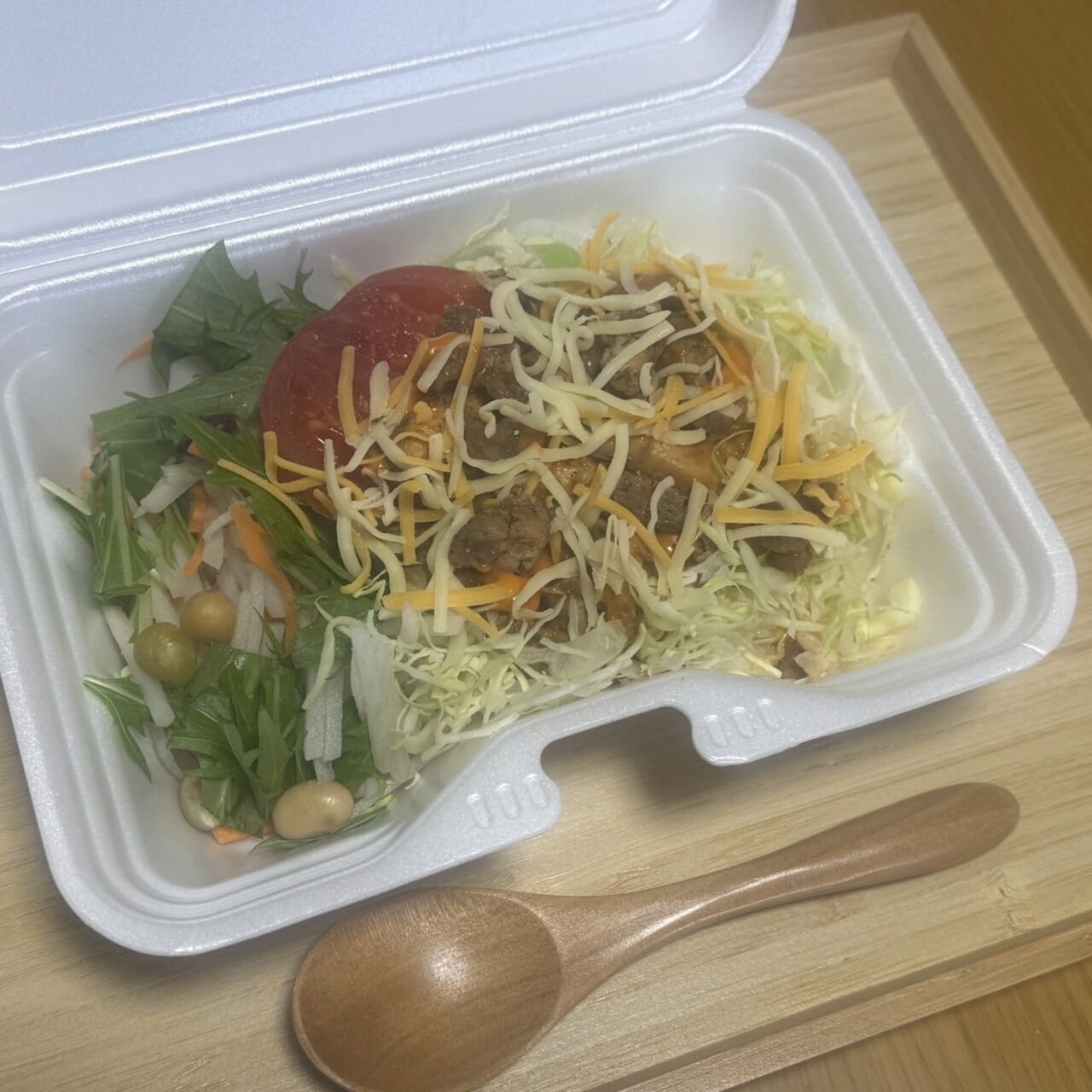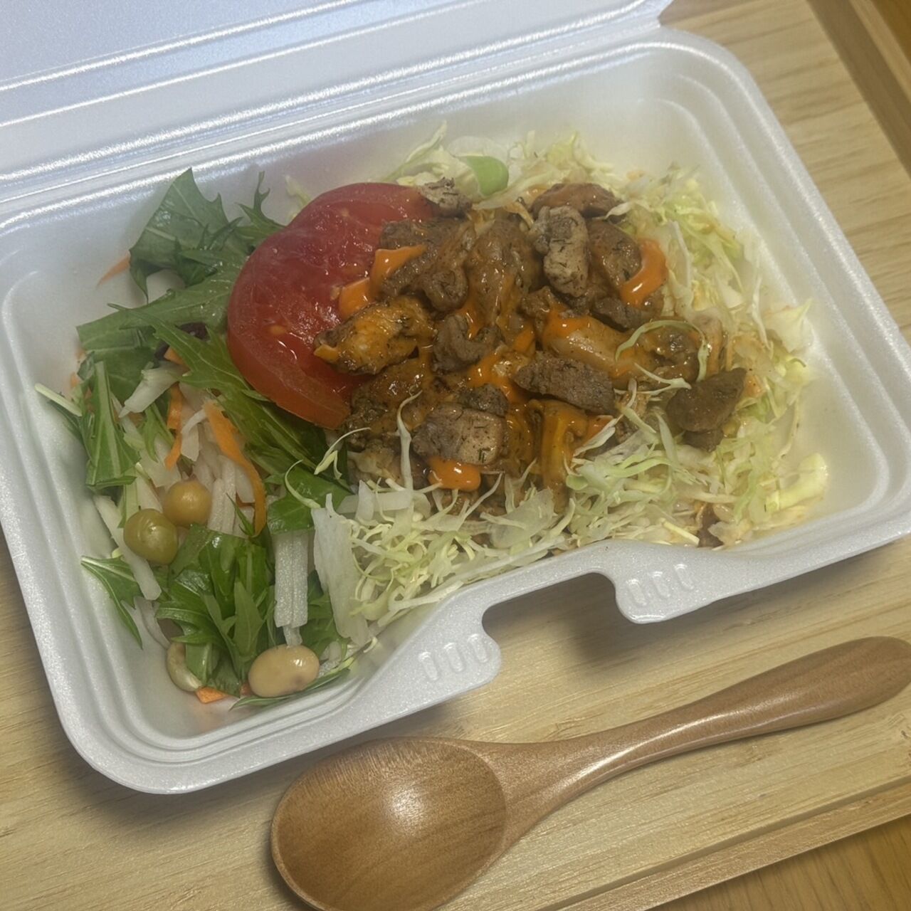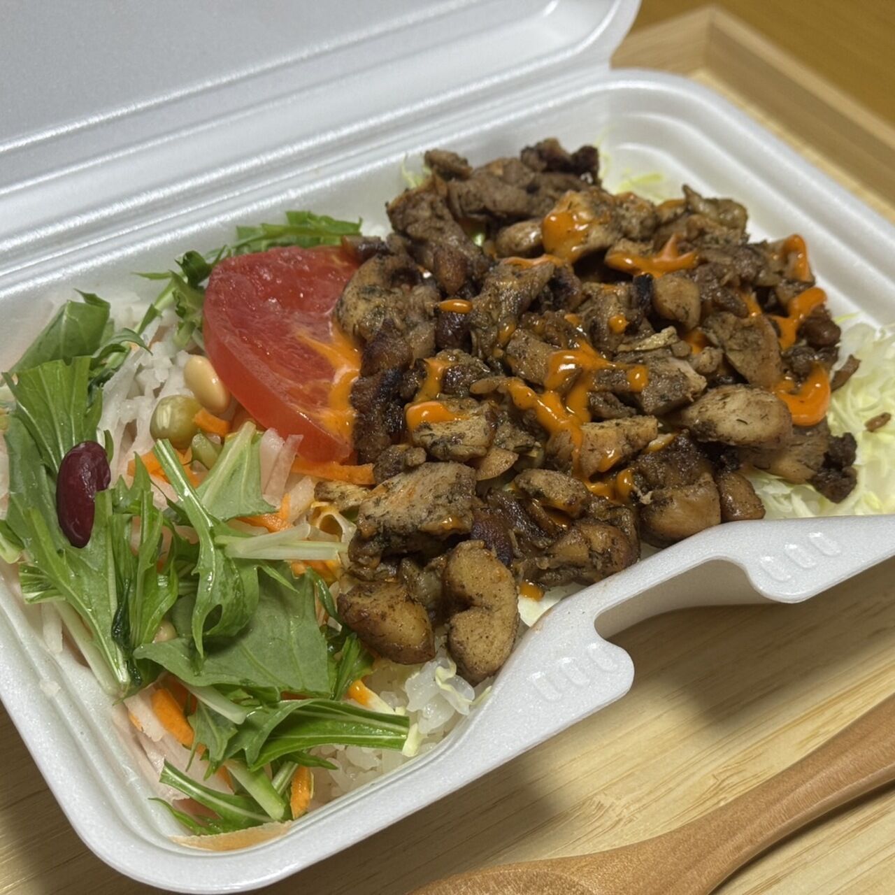 ミニサイズのケバブ丼にサラダをトッピング。お野菜多めで食べやすくてヘルシー。サラダは日によって内容が変わります。ドレッシング選べます。