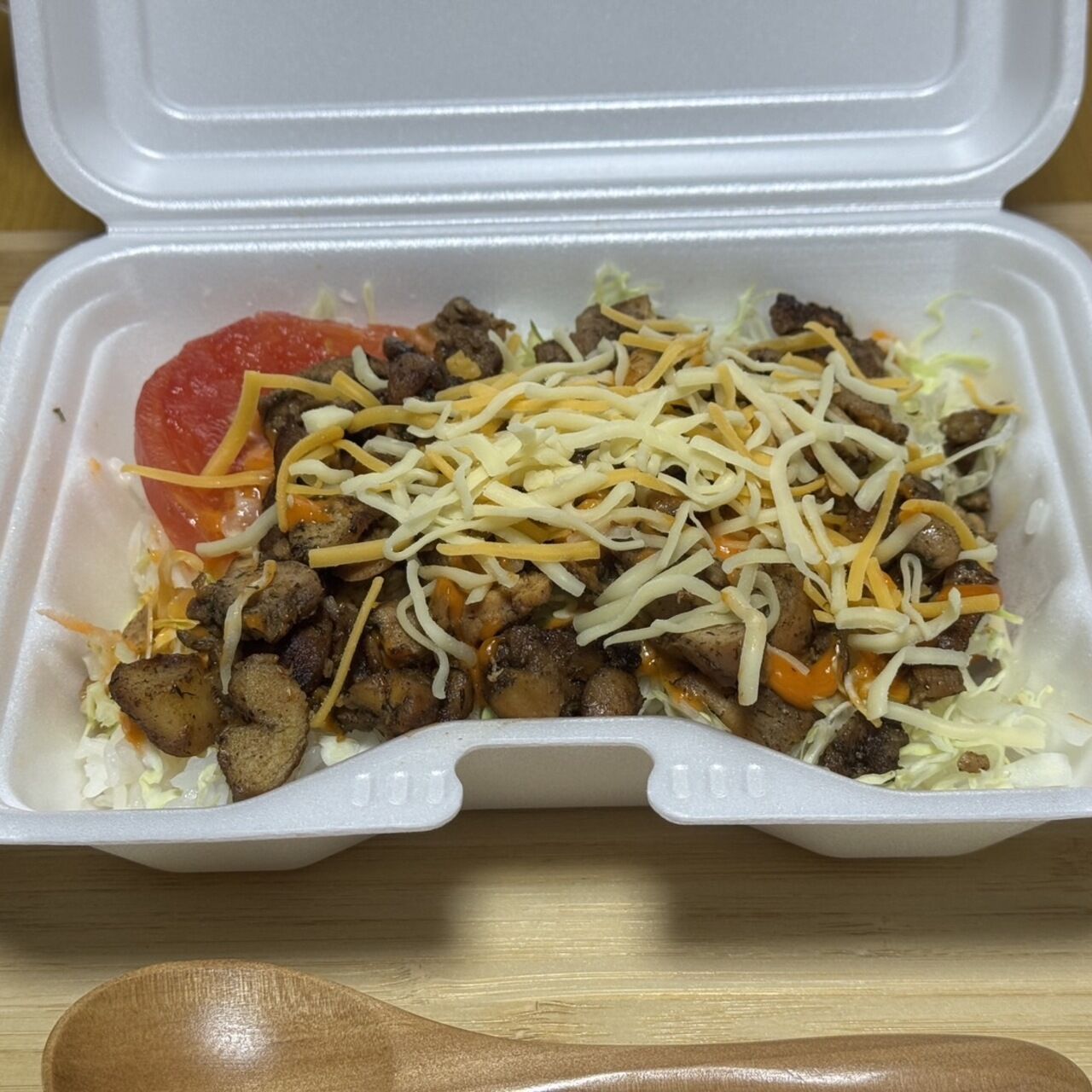 ミニケバブ丼にサラダとチーズを乗せ、栄養バランスが良い一品です。サラダは日によって内容が変わります。ドレッシング選べます。
