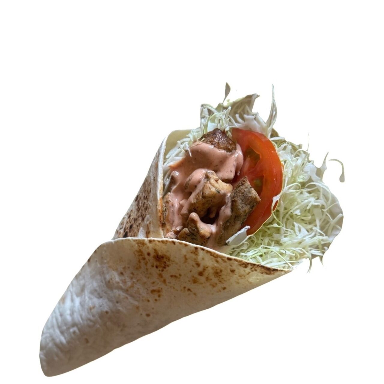 スパイシーなチキンケバブをトルティーヤで包み、ワンハンドで食べやすい形になっています
