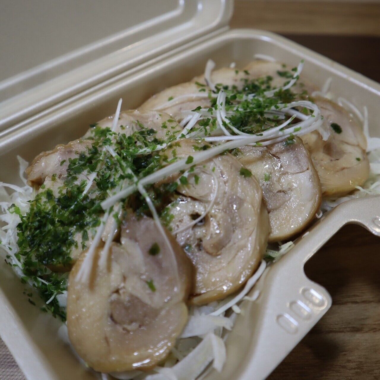 豚チャーシューに玉ねぎたっぷりのタレをかける