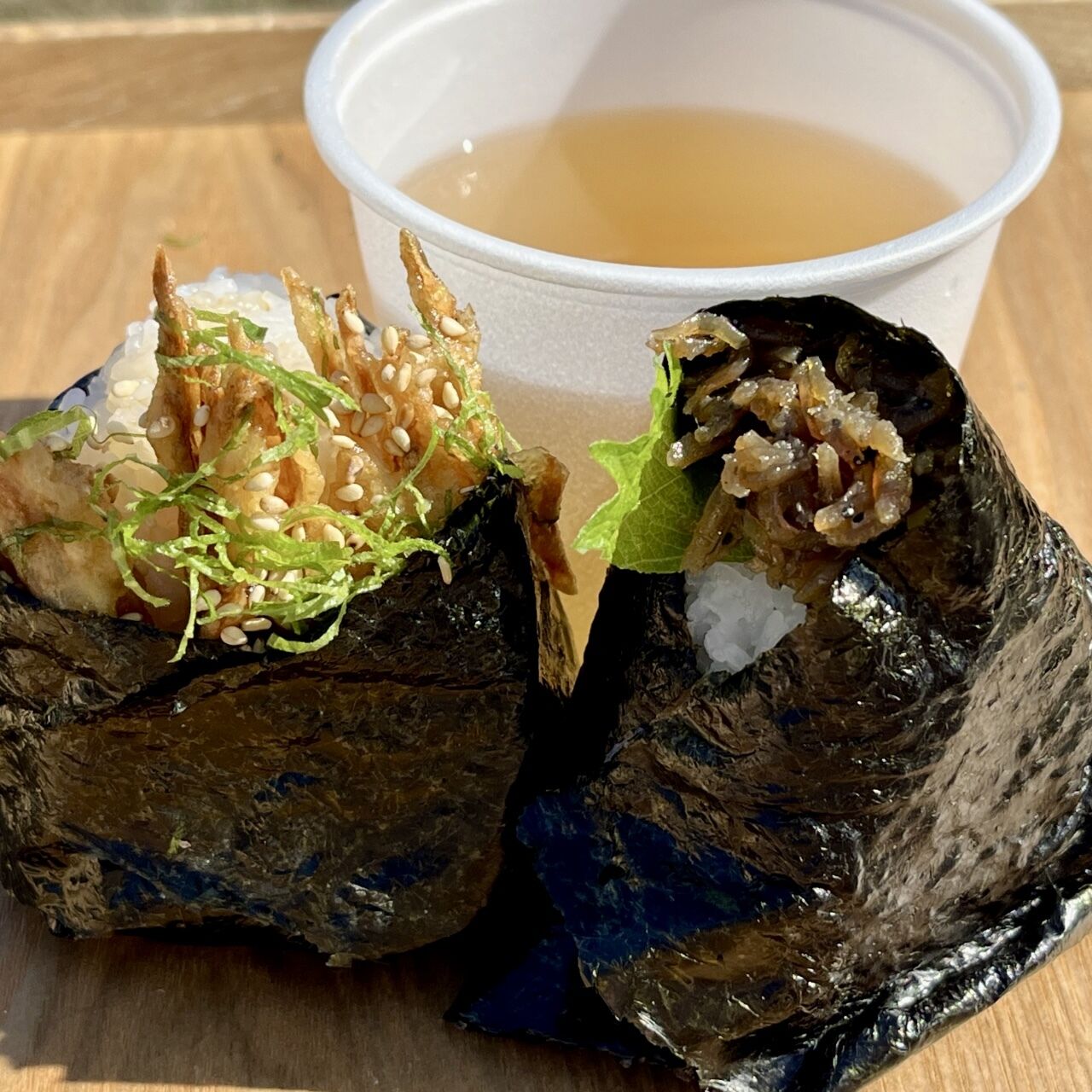 仕事の合間にほっとするお昼を。人気ごぼう天を含む4〜5種類の中から選べるおにぎり2個とやさしい出汁のセットです。