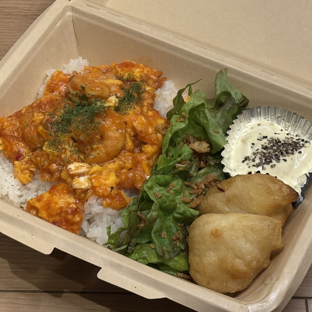 エビ卵チリソースとフィッシュフリッターのお弁当です