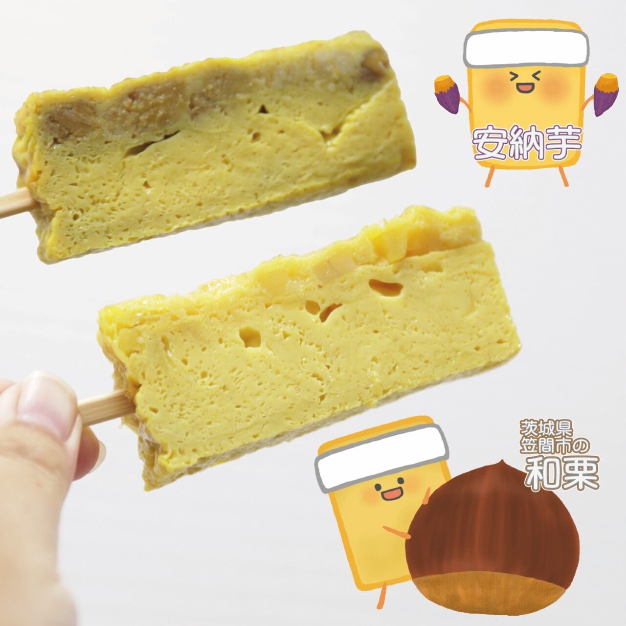 安納芋の玉子焼と茨城県笠間市の和栗使用の玉子焼を食べやすいたまご串に