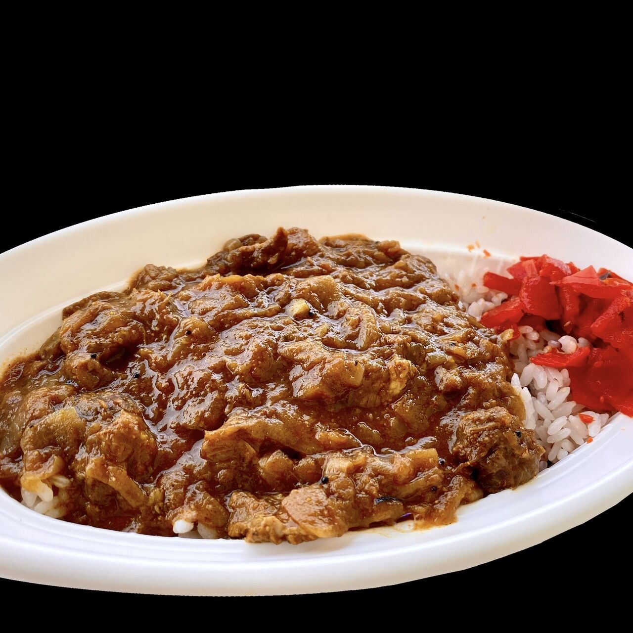 カレーのルーは和牛国産牛すじカレー、シンプルに福神漬けを添えて。