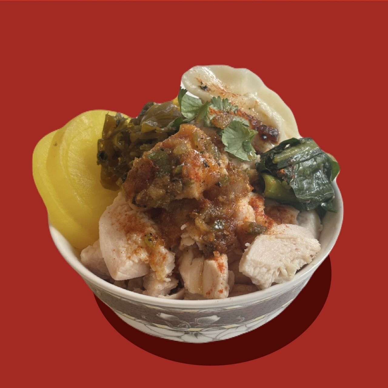 しっとり蒸し上げた鶏肉に花椒、唐辛子、香味野菜の特製ダレをかけた旨味たっぷり鶏飯。高タンパク、低脂質。 免疫力アップや腸内環境ケアが期待できる。