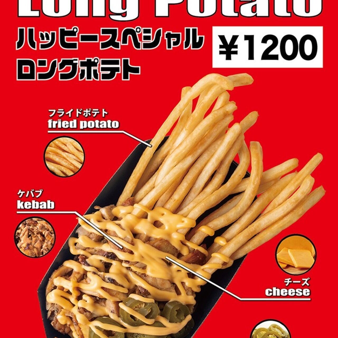 カリッと揚げたロングポテトに、ケバブのお肉、チェダーチーズ、ハラペーニョをのせました。 ボリューム満点でピリ辛の一品です。