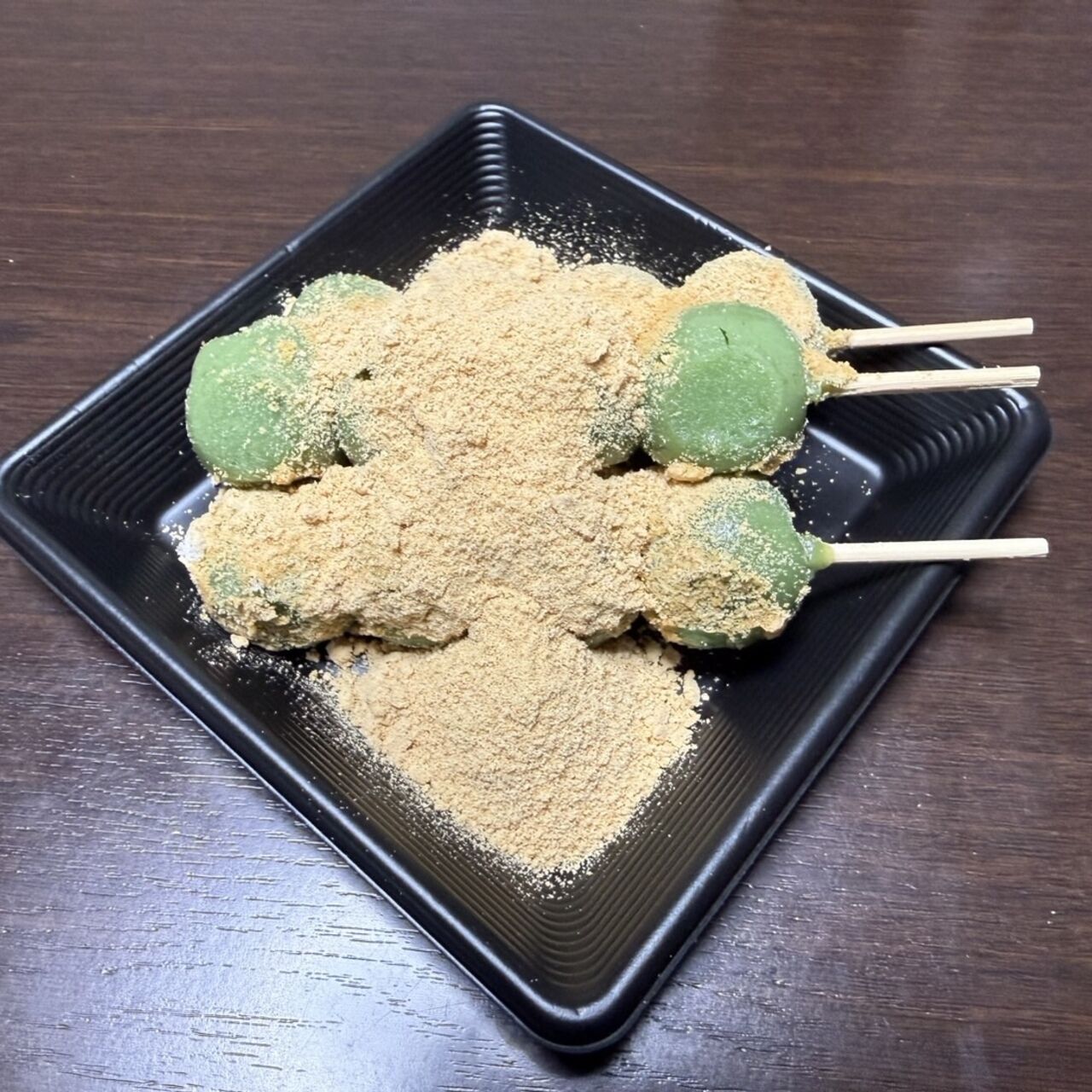 たっぷりきな粉をかけたよもぎ団子串です。