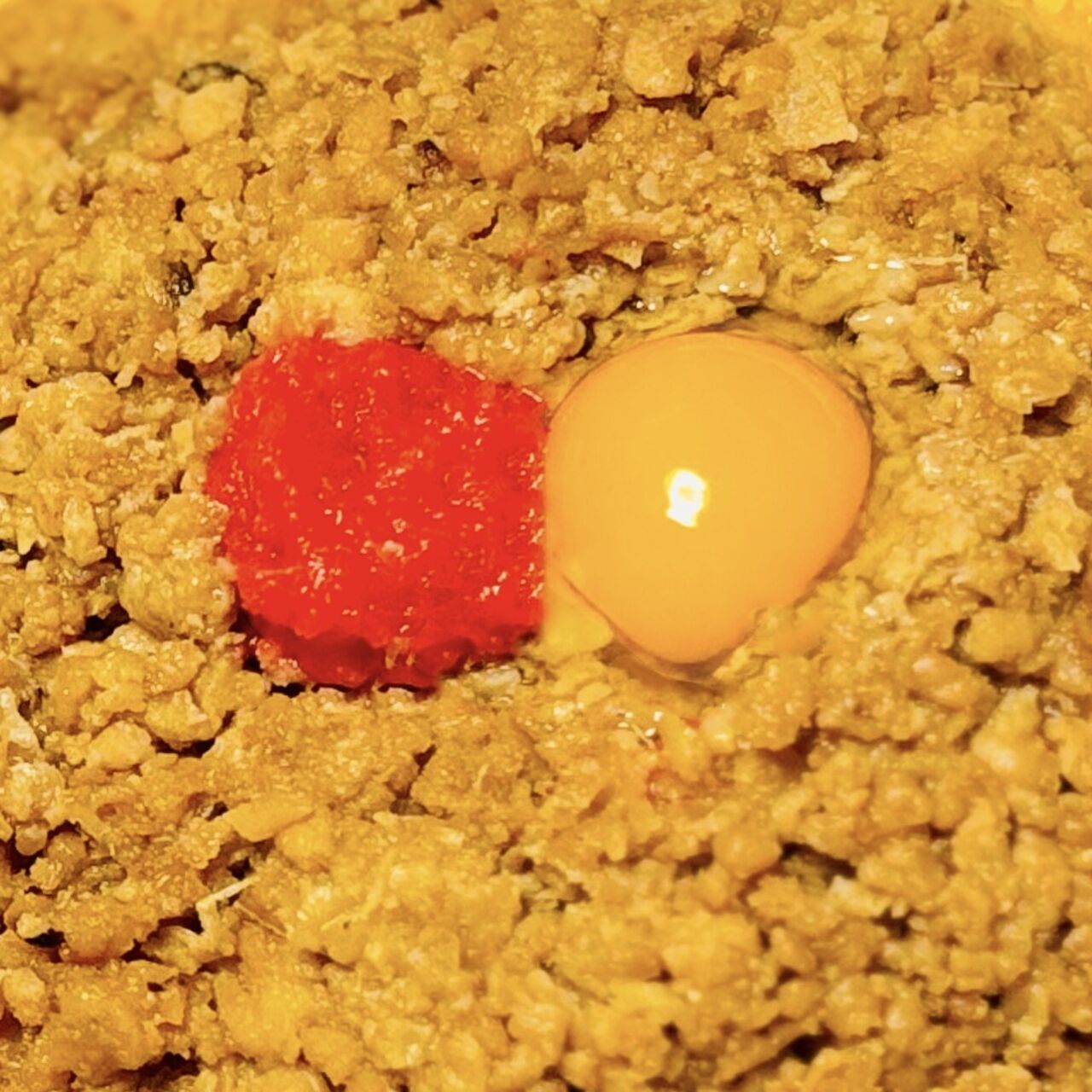 ひき肉を野菜出汁で炊き、自家製の背脂風鶏脂で旨味を凝縮させた甘辛い肉そぼろです