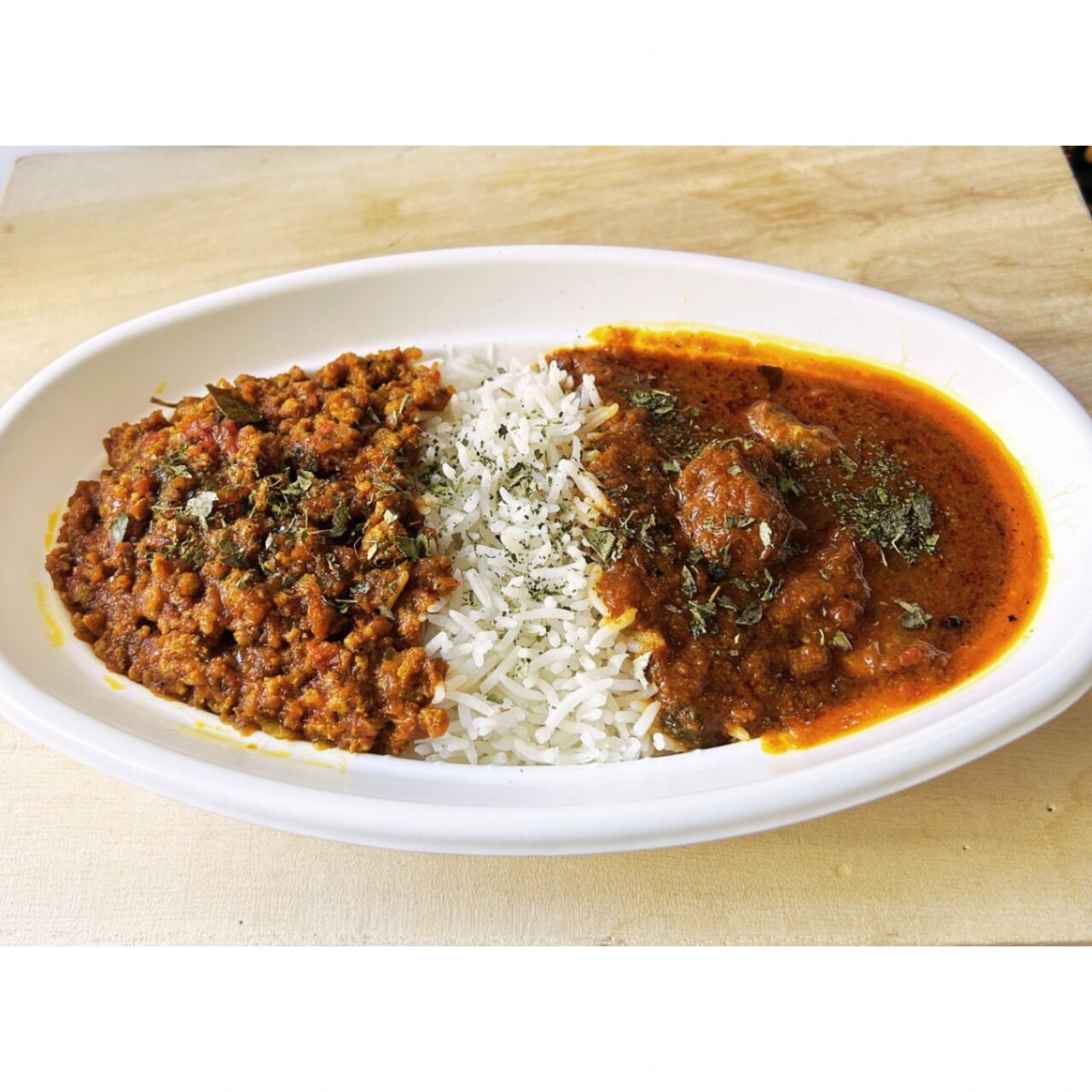スパイスチキンカレーとキーマカレーの合がけ。どちらか迷ったとき、どちらも食べたいときにどうぞ😋