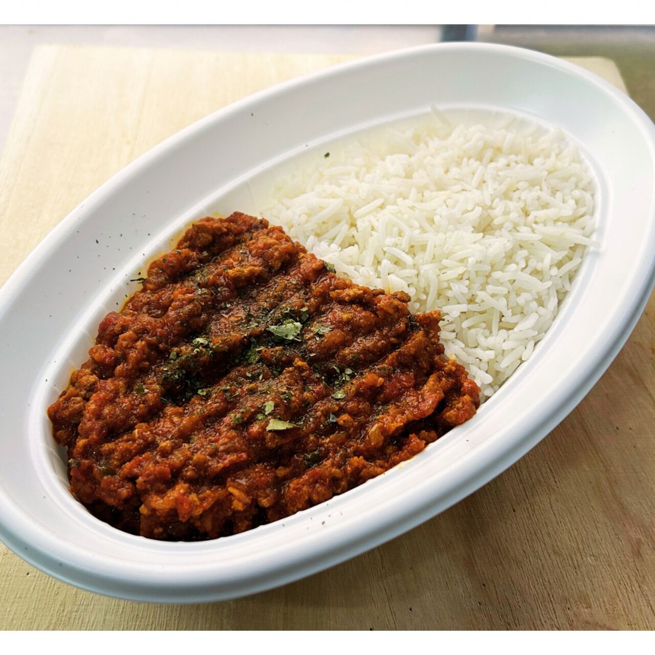 オリジナルブレンドのスパイスにこだわった豚ひき肉のキーマカレー。生姜のシャリシャリ感がアクセント。バスマティライスにも良く合います。