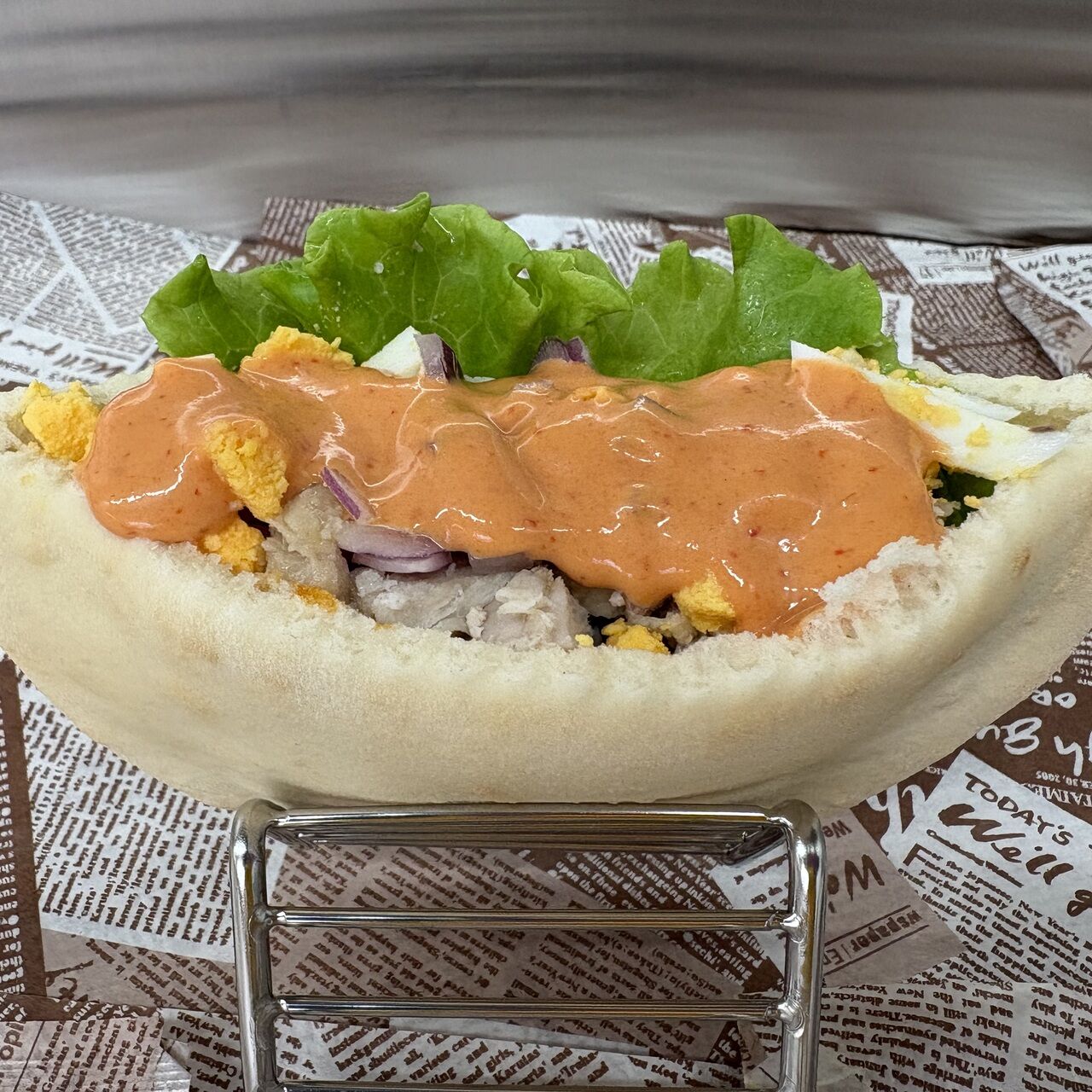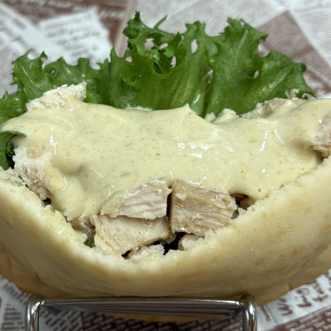特製タレに漬け込んだ柔らかな鶏肉をテリヤキチキンにしてピタパンに挟みました。レモンマヨネーズソースが相性抜群です。少し小さいサイズも600円であります。