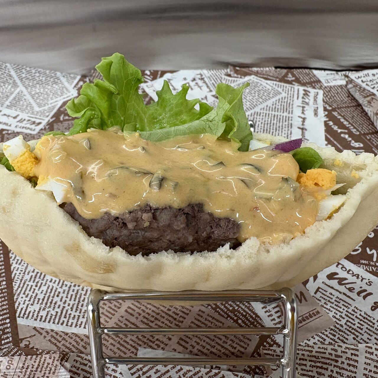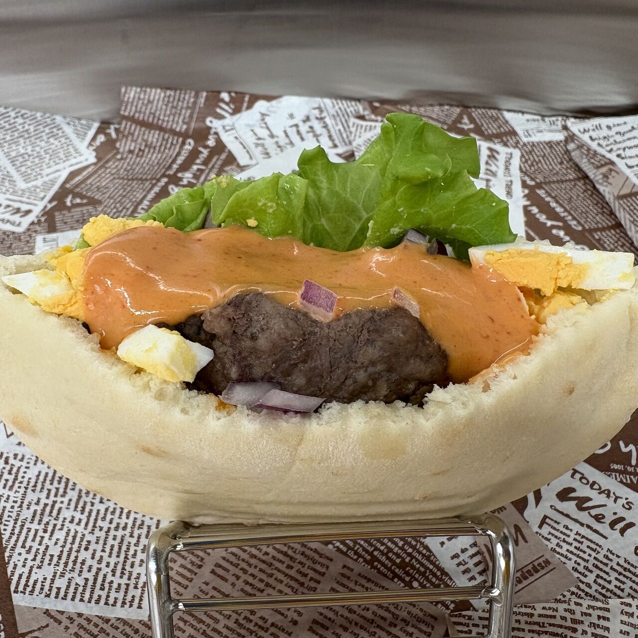 ピタパンに手作りジューシーハンバーグ、1度食べたらクセになるオリジナルスパイシーソースを合わせた絶品ピタサンドです。Sサイズ600円もあります。