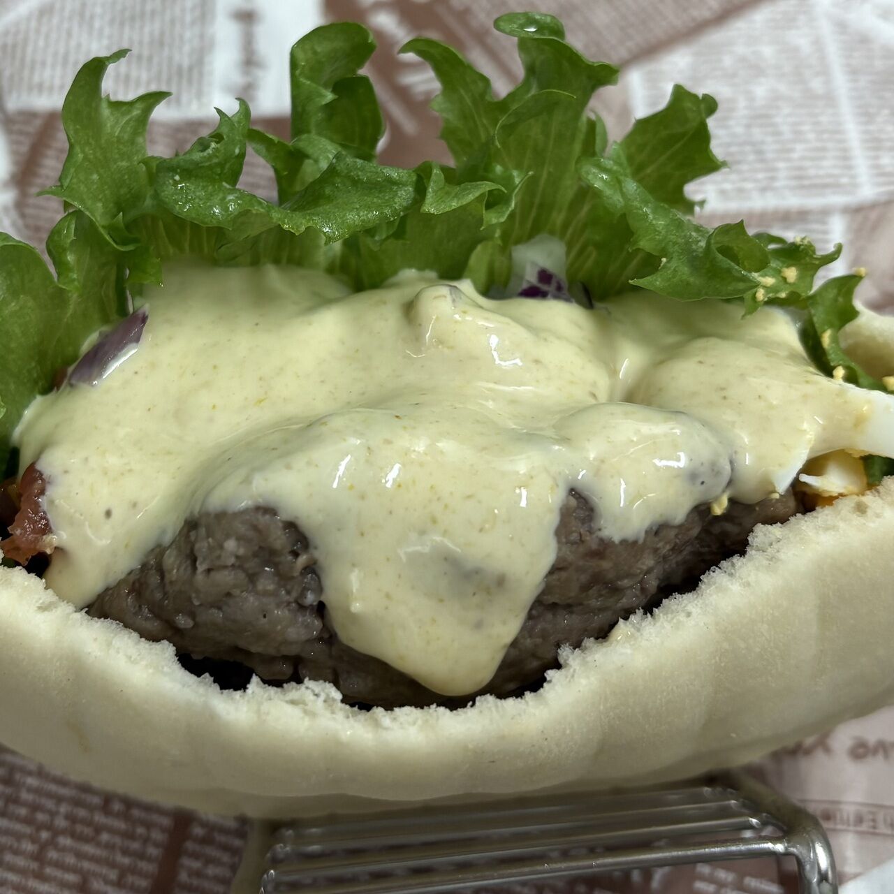 ピタパンに手作りジューシーハンバーグ、オリジナルオーロラソースを合わせた絶品ピタサンドです。Sサイズ600円もあります。