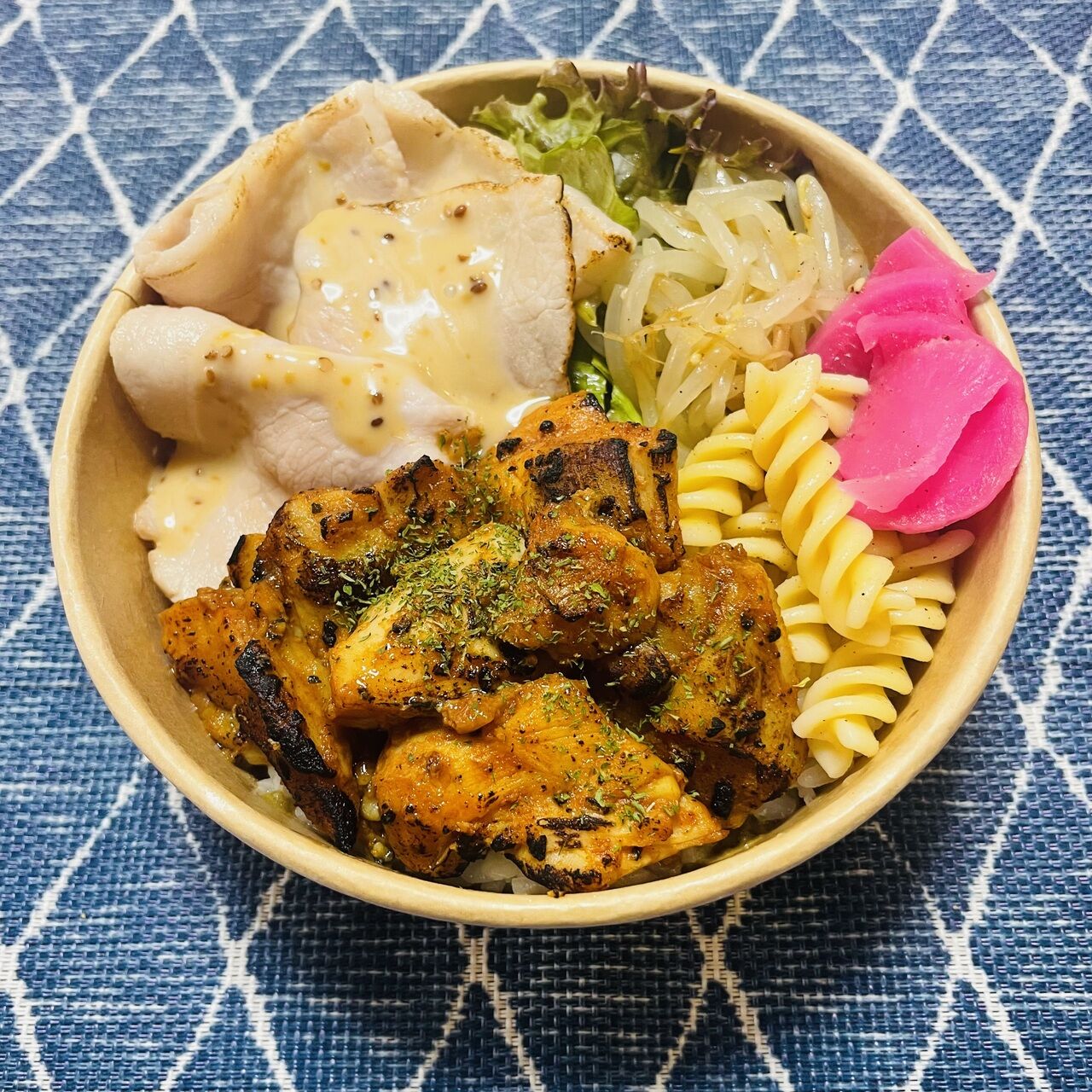 1番人気のローストポークとスパイシーチキンがどちらも乗った贅沢でボリューム満点な丼です。ローストポークはソースが6種類あるのでバリエーションも豊富です!