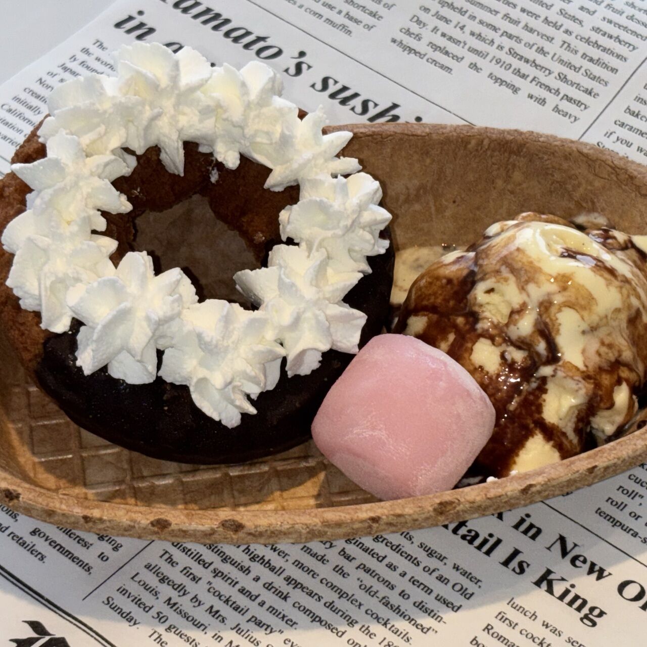 揚げたてのドーナツにホイップクリームやアイスをトッピングして提供します。
