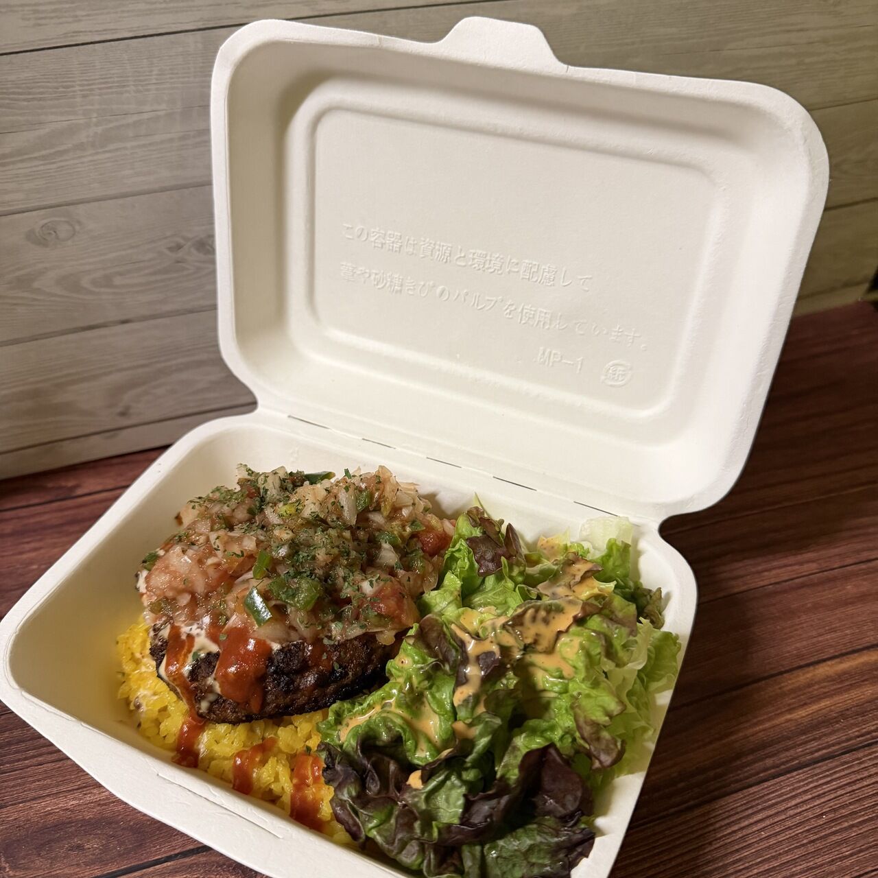 数種のスパイスでスパイシーなチョリソ風に味付けしたボリューム満点のサルサソースとレッド&ホワイトソースでいただくハンバーグライスです。