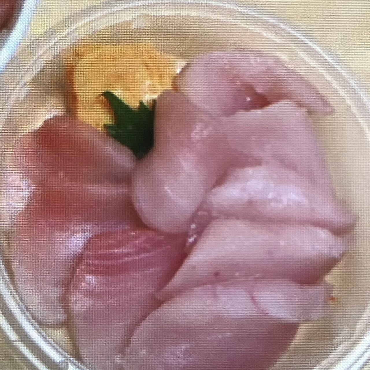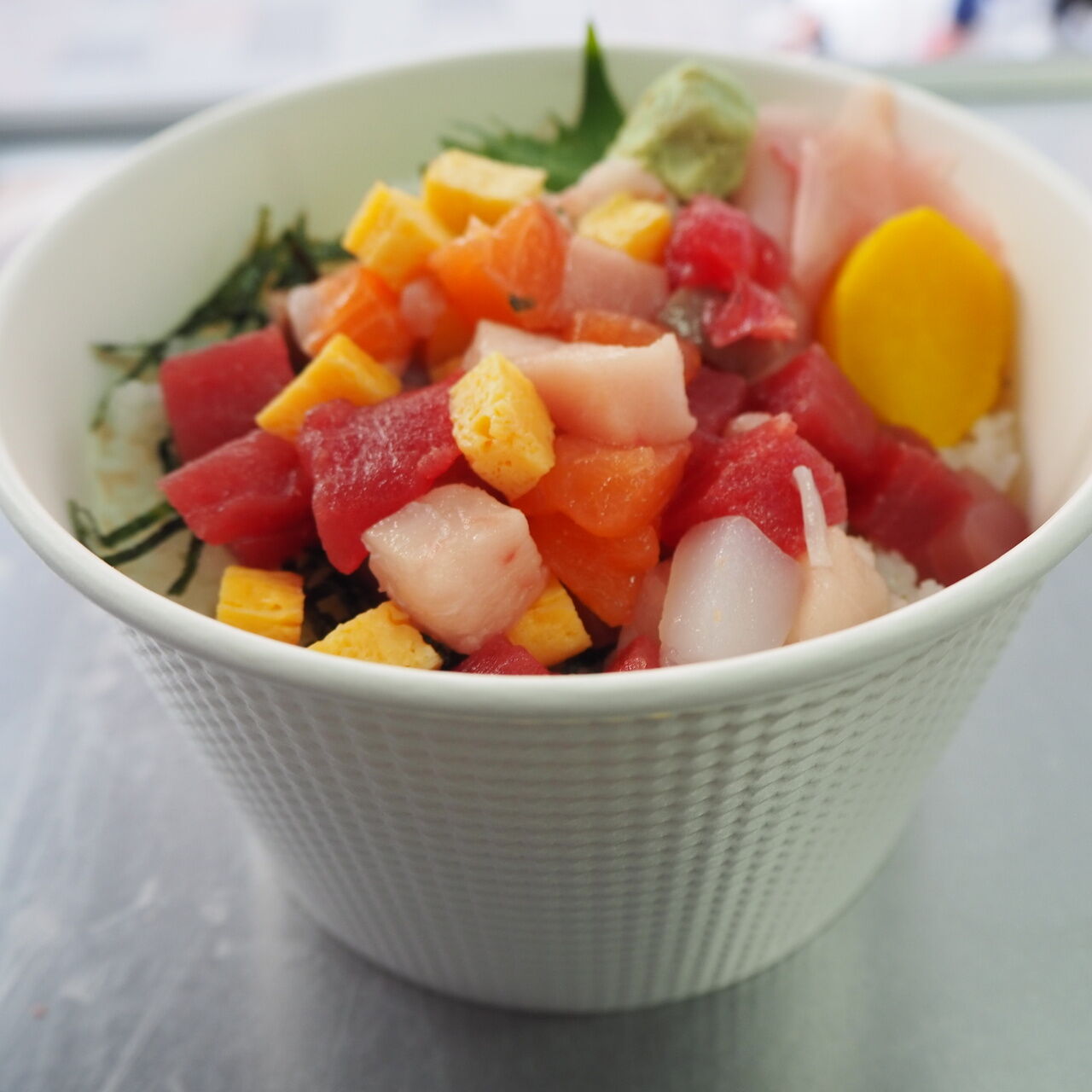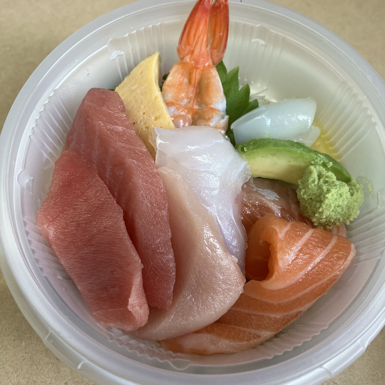 まぐろ、サーモン、いか、白身なとの切り落としやブツ切りをまとめた海鮮丼です。