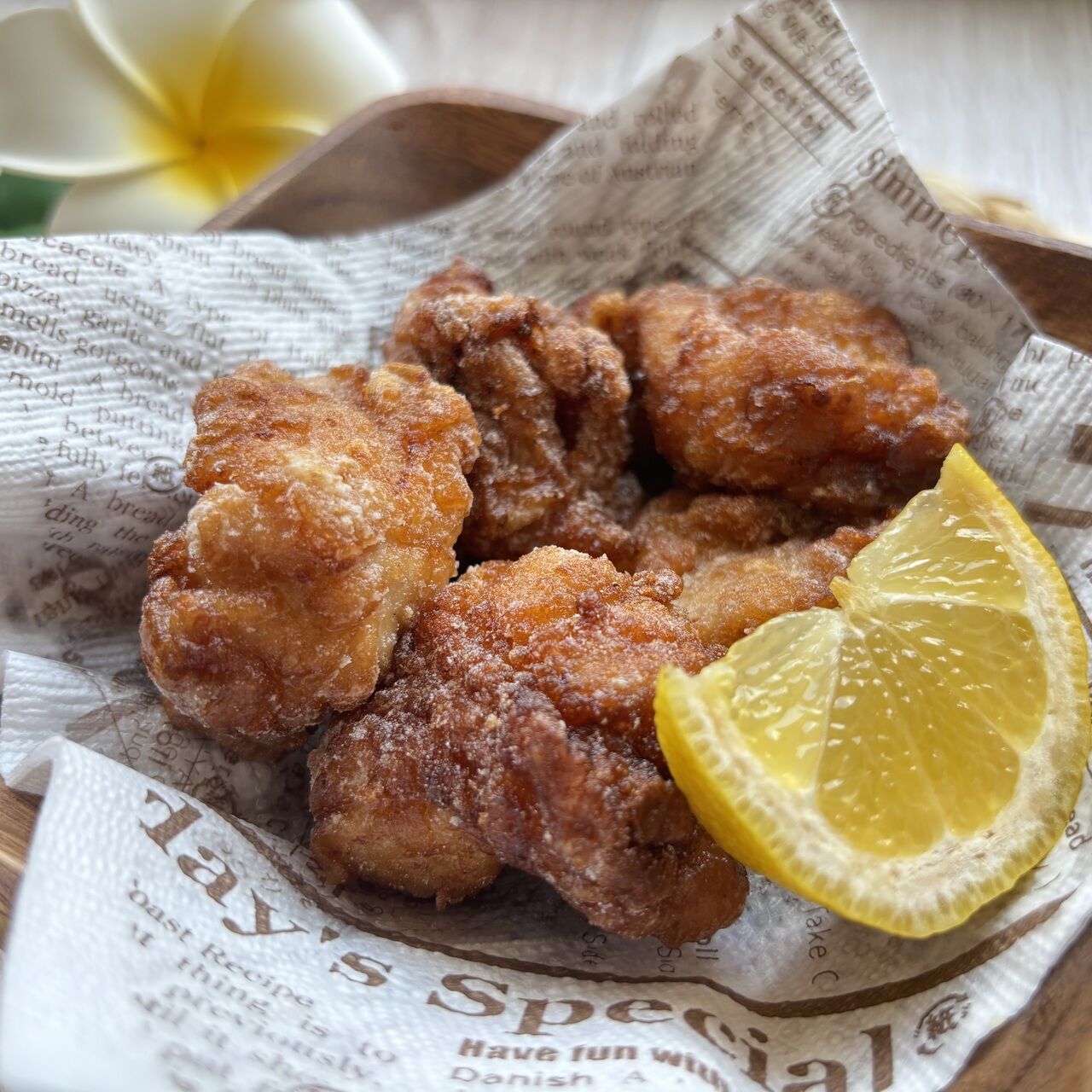 鶏もも肉を甘辛だれで漬け込み、米粉で揚げたハワイアン唐揚げ丼(はちみつ使用)