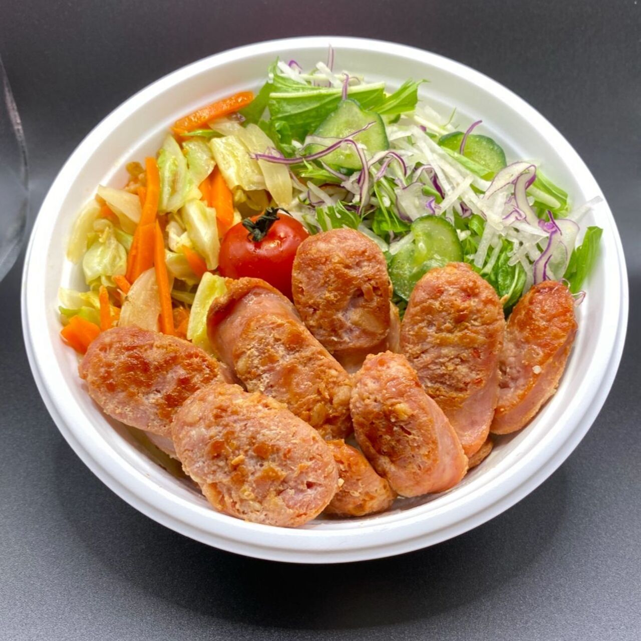 フレッシュ チキンソーセージ、野菜 炒め、グリーンサラダ、白ごはん。