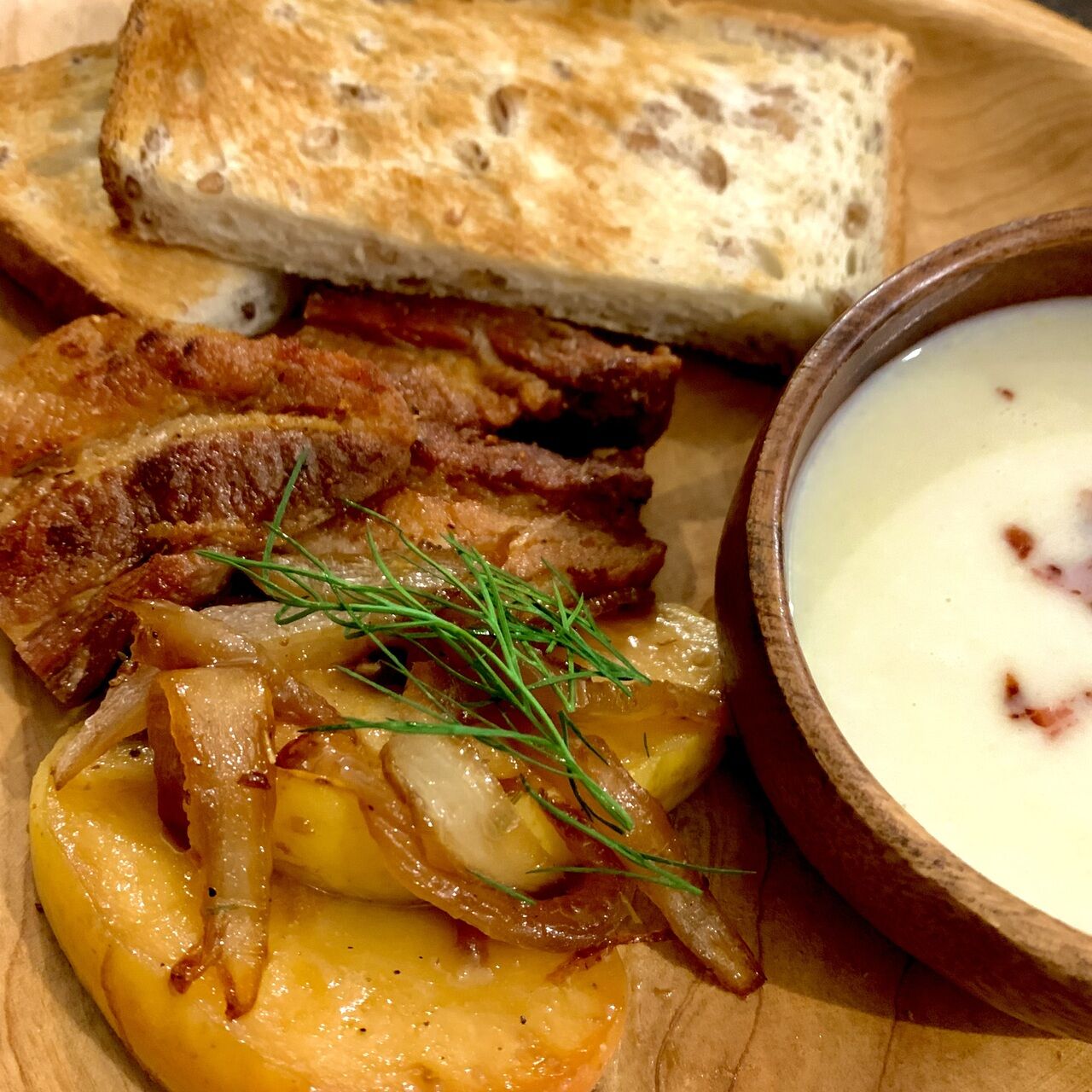 カリカリに焼いた豚バラ肉にリンゴのソテーを添えたデンマークの伝統的な家庭料理にデンマークで愛されるジャガイモのスープを添えました♪