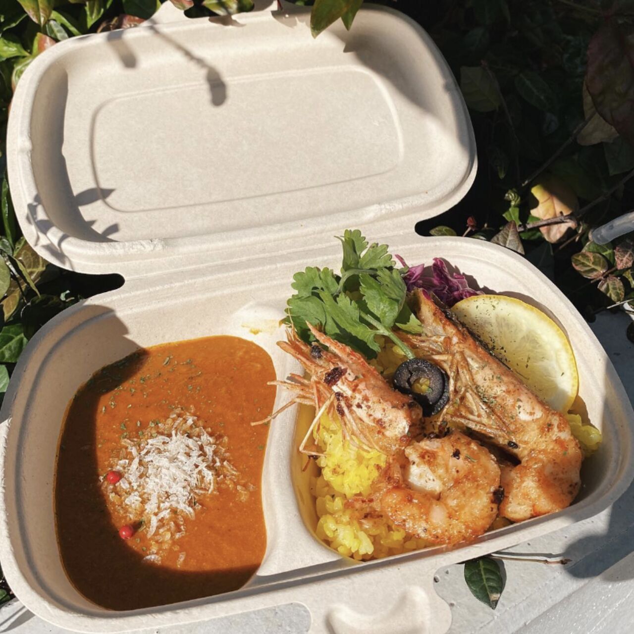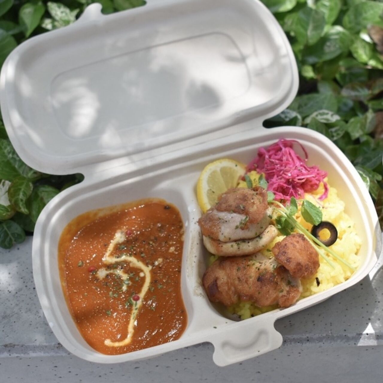 イタリア産の完熟トマトと 20 種類のスパイスを使ったカレー。 ローズマリーを効かせたチキンとターメリックライスで召し上がれ!